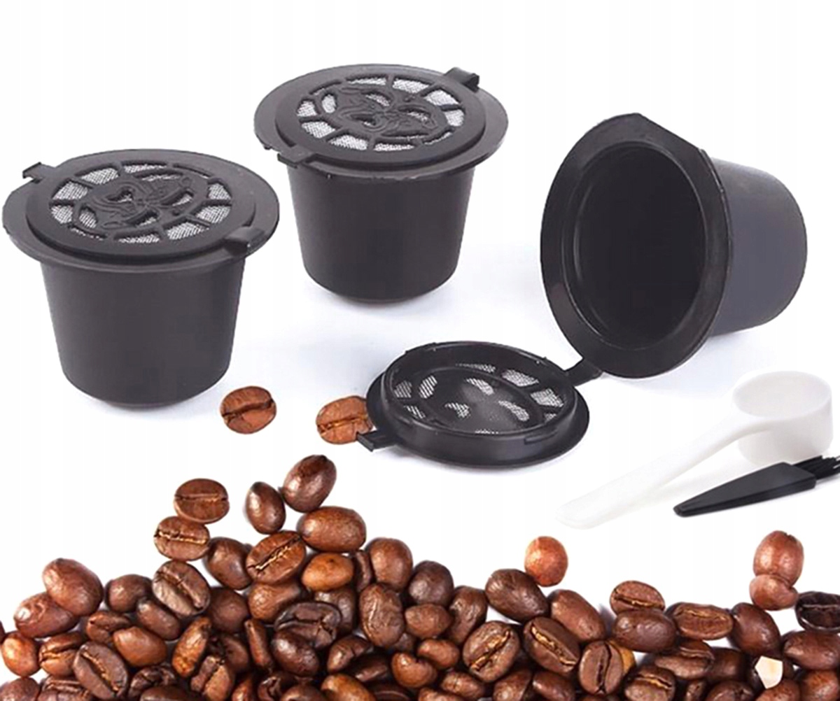 Набор из 5 многоразовых капсул для заваривания кофе. Каждая капсула позволяет заваривать кофе до 100 раз благодаря многоразовому стальному фильтру. Вам не обязательно постоянно покупать новые дорогие капсулы! Чрезвычайно прост в использовании (просто наполните капсулу кофе, закройте крышку и вставьте ее в кофемашину отверстием внутрь). Продукт совместим с кофемашинами Nespresso. В комплект входит ложка для отмеривания кофе и щеточка для чистки.