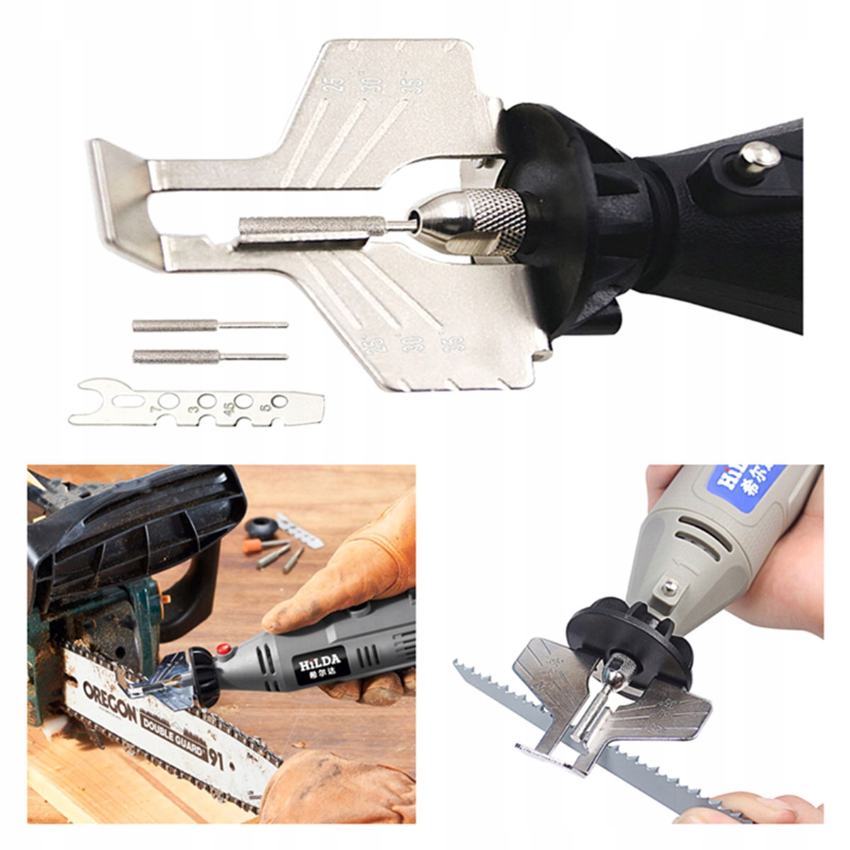 Компактная универсальная точилка для бензопилы со шкалой. Легкая и прочная конструкция позволяет быстро заточить цепь во время перерыва в работе. Точилка совместима с большинством бензопил с двойным отверстием. Инструмент имеет монтажную ручку, позволяющую разместить его на болгарке. Оснащен 3-мя сменными шлифовальными роликами диаметром 4,5 мм, 5 мм и 6,5 мм.