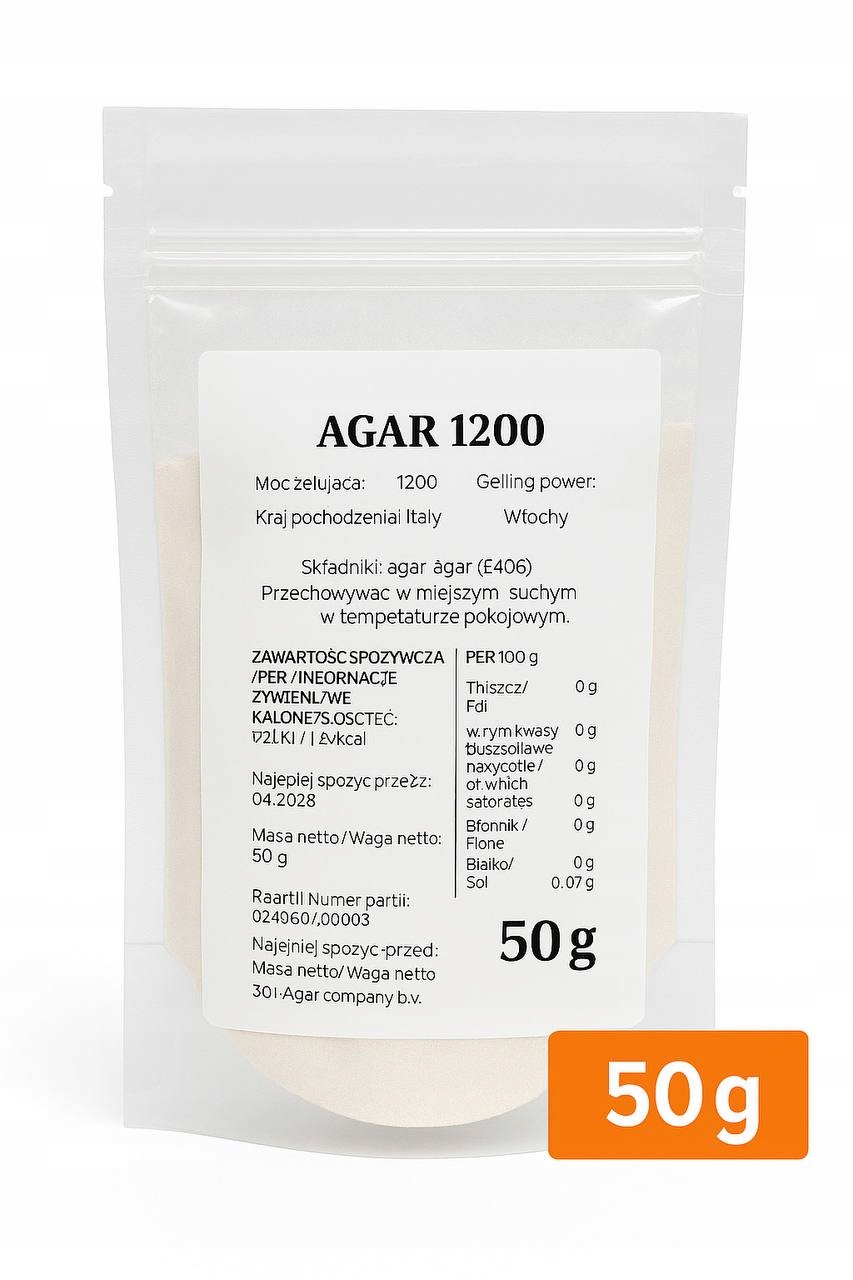 Agar 1200 - это натуральный гель продукта растительного происхождения, полученный из красных морских водорослей. Он идеально подходит для приготовления желе, гелей, муссов, кремов, десертов и молекулярных блюд. Он характеризуется высокой гелевой силой и является отличной альтернативой желатину животного происхождения. Использование: 2-10 г агара на 1 литр жидкости обычно используется, в зависимости от желаемого мерина. Агар должен растворяться в холодной жидкости, затем довести до кипения и готовить около 1 минуты. После охлаждения масса затвердевает.
