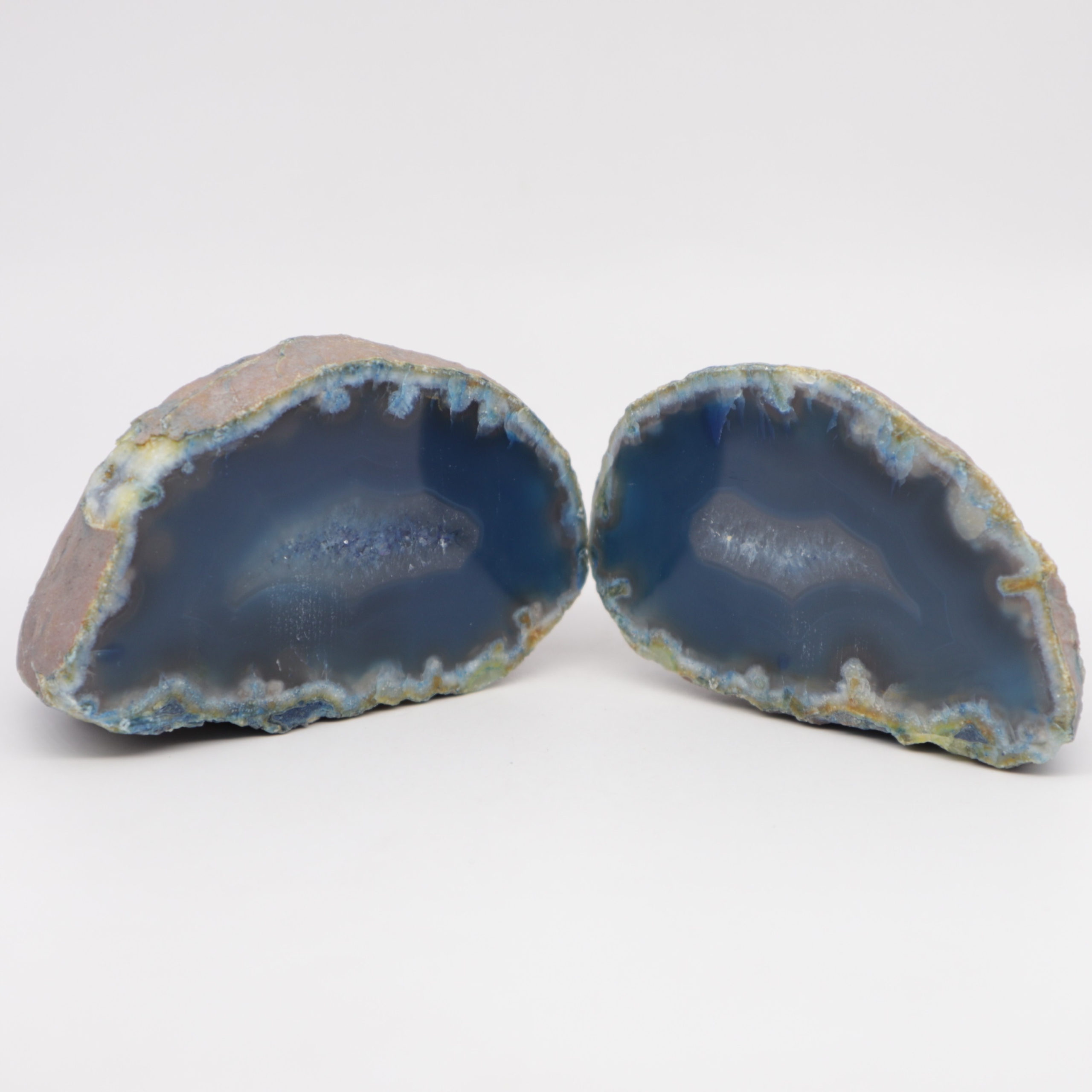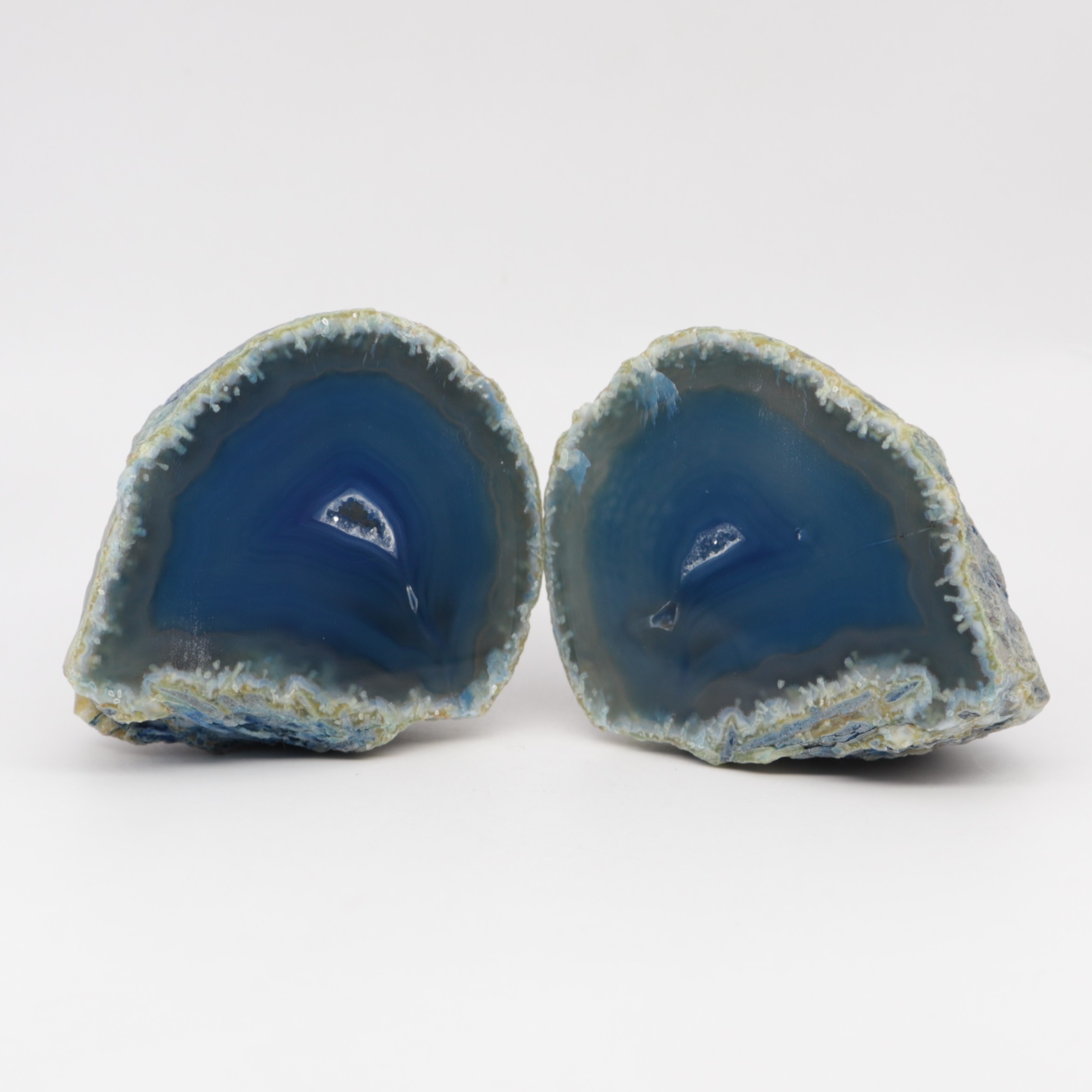 Агат — минерал, образованный небольшими слоями скрытокристаллического кварца, халцедона и опала. Агатовая луковица — это необработанный кусок агата, окрашенный в синий цвет и разрезанный пополам. Лицевую сторону полировали, а дно и бока оставались необработанными, иногда слегка закругленными, чтобы камень стоял свободно. Благодаря такой обработке можно выделить уникальные узоры и регулярные полосчатые линии, типичные для этого агата. Некоторые разновидности также имеют небольшие полости, заполненные мелкими кристаллами кварца. Агат добывается в шахтах штата Рио-Гранде.