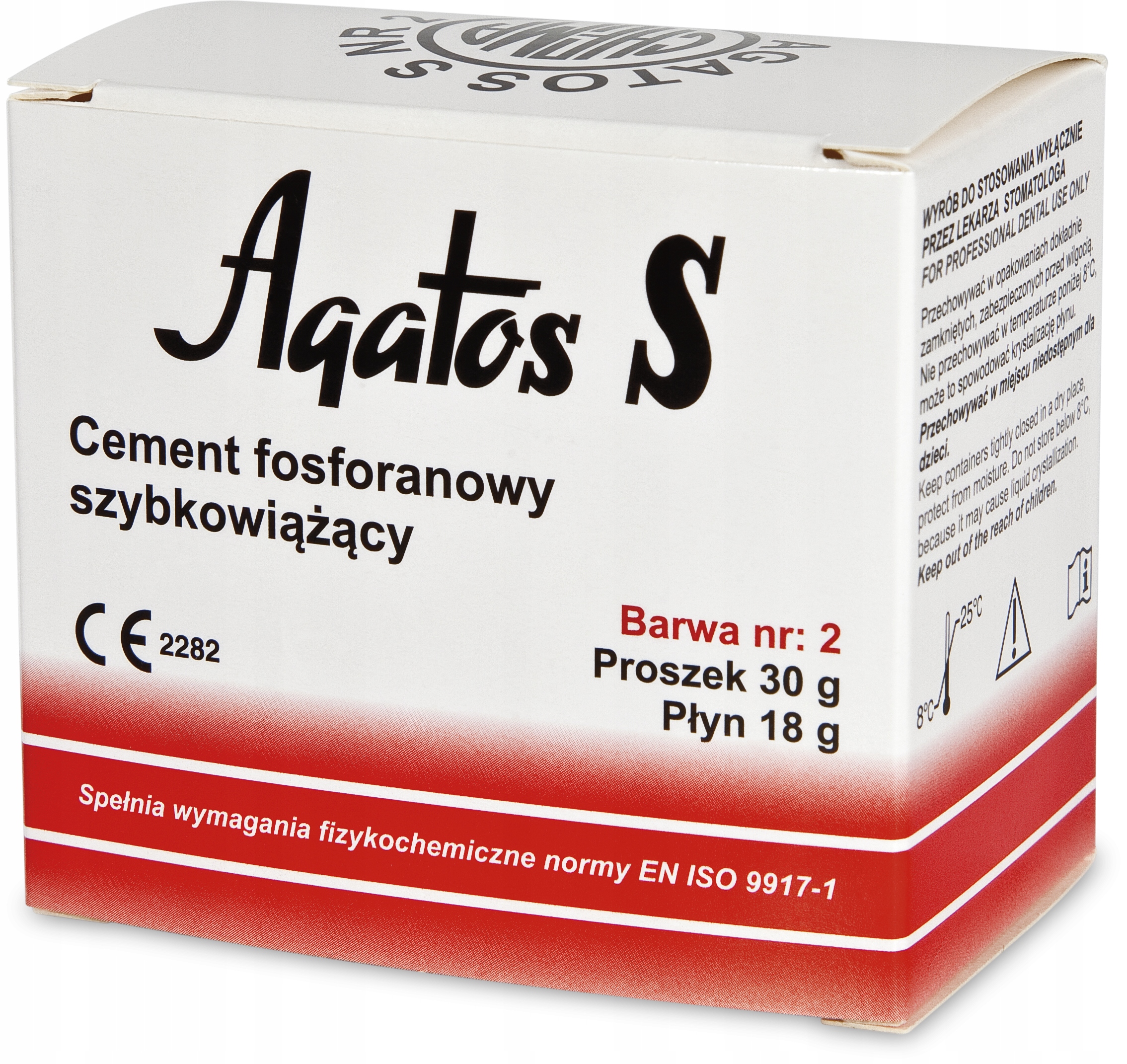AGATOS S предназначен в первую очередь для цементирования коронок, мостовидных протезов и короночно-корневых вкладок, а также для тонко- и толстослойных базисов. Его также можно использовать для пломбирования корневых каналов, особенно при подготовке зуба к резекции верхушки корня. Цемент вызывает плотное закрытие апикального отверстия корня зуба. При пломбировании корневых каналов помните, что цемент очень твердый и его будет трудно удалить при необходимости.