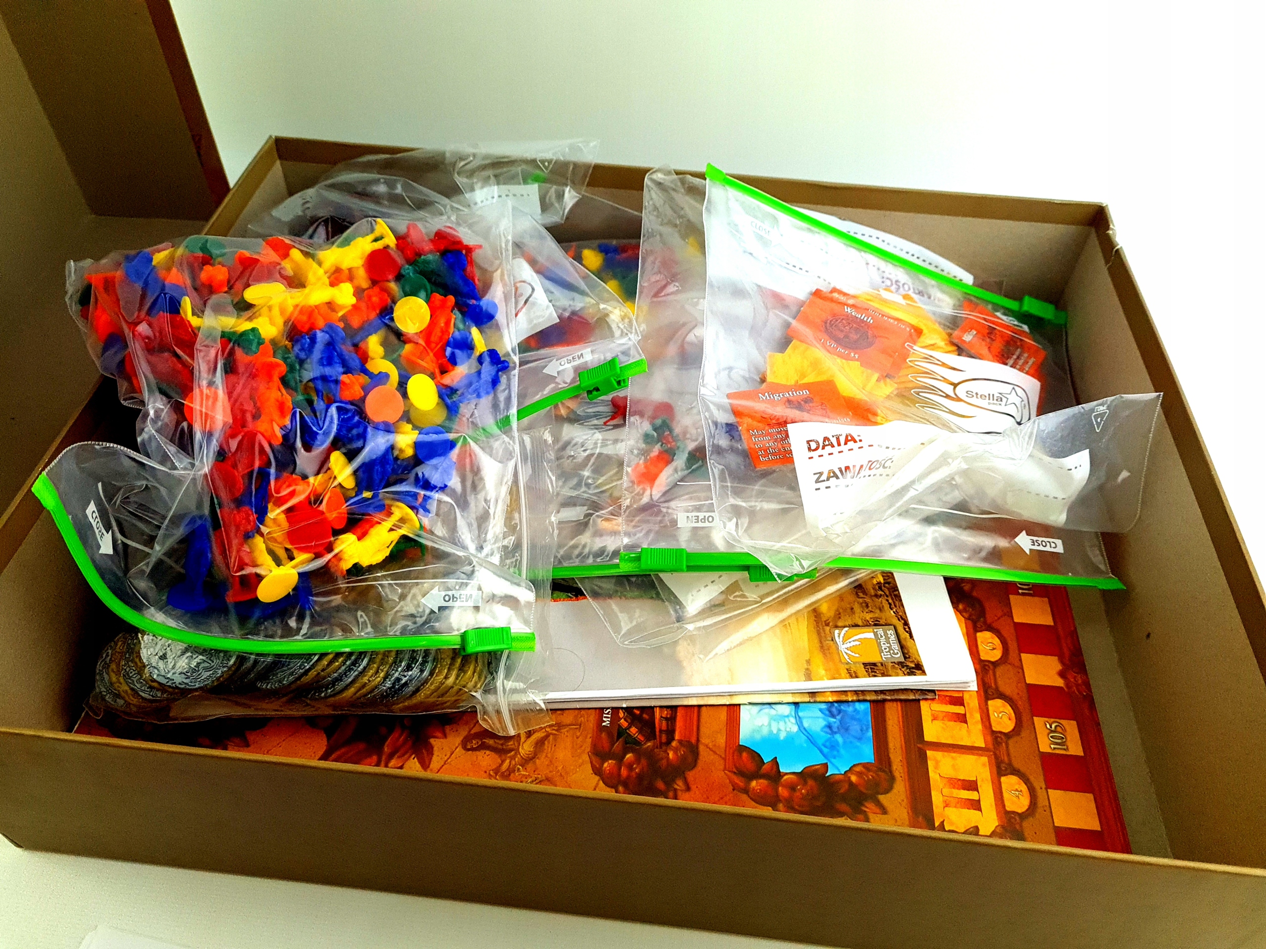 Игры всегда хранились на чистых полках, защищенных от пыли и вредного солнечного света, из-за которых цвета коробок могут потускнеть. Коробки всегда располагались на полках вертикально с небольшими промежутками между коробками, не сжимались и не складывались друг на друга. Коробки снимали с полки минимальное количество раз (раз в 2-3 года), чтобы ограничить ущерб при их перемещении. Помещение для хранения коллекционных игр подготовлено должным образом: слегка охлаждается летом, слегка обогревается зимой, всегда закрыто от солнца и часто проветривается, защищено сетками от насекомых. В комнате никогда не курили и не ели, что ограничивает поглощение запахов коробками с играми. Любые незначительные повреждения, видимые на некоторых коробках, были сделаны до того, как они были куплены для моей коллекции.