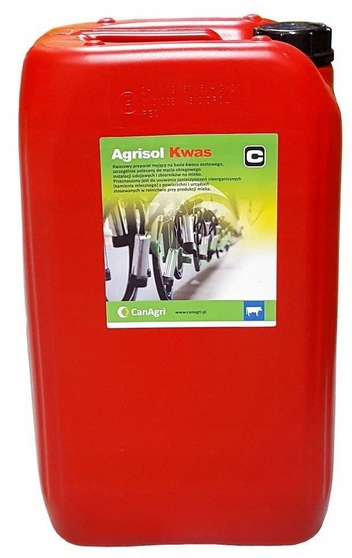 Agrisol Kwas – кислотное, беспенный чистящий препарат, предназначенный для удаления неорганических примесей (молочной и водной накипи) с доильного оборудования и охладителей молока. Благодаря использованию 3 различных кислот обладает отличными чистящими свойствами.