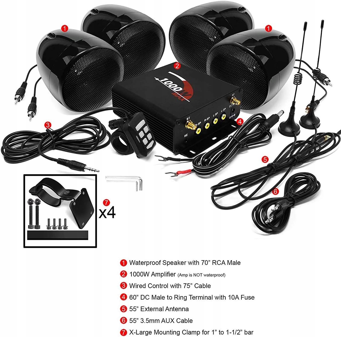 - 4-канальный усилитель Aileap мощностью 1000 Вт для мотоциклов, квадроциклов, UTV, стереодинамики с высокими басами. В комплект входит новый монтажный зажим X-Large для стержней размером от 1 до 1,5 дюйма. Совместим с вешалкой и защитной планкой диаметром 1–1/2 дюйма.