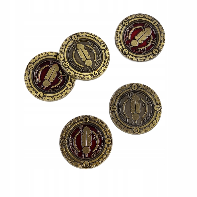 В этой категории вы найдете металлические монеты, связанные с определенными темами или названиями игр. В наборах присутствуют изделия, имитирующие золото (покрытое слоем латуни), серебро (со слоем никеля) или медь (со слоем меди). Их дизайн отсылает к постапокалипсису, фэнтези, стимпанк-играм в атмосфере Средневековья, античности, космоса и романам Лавкрафта.