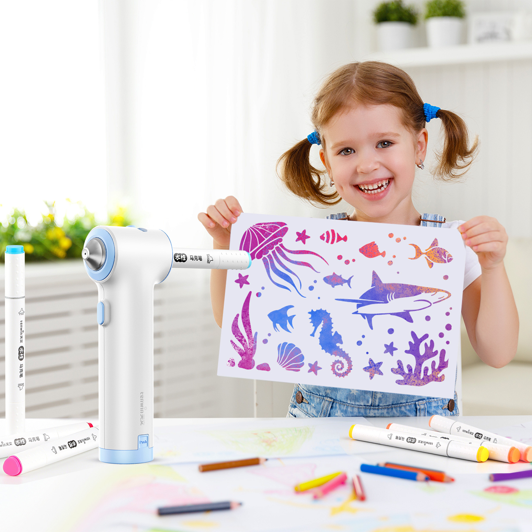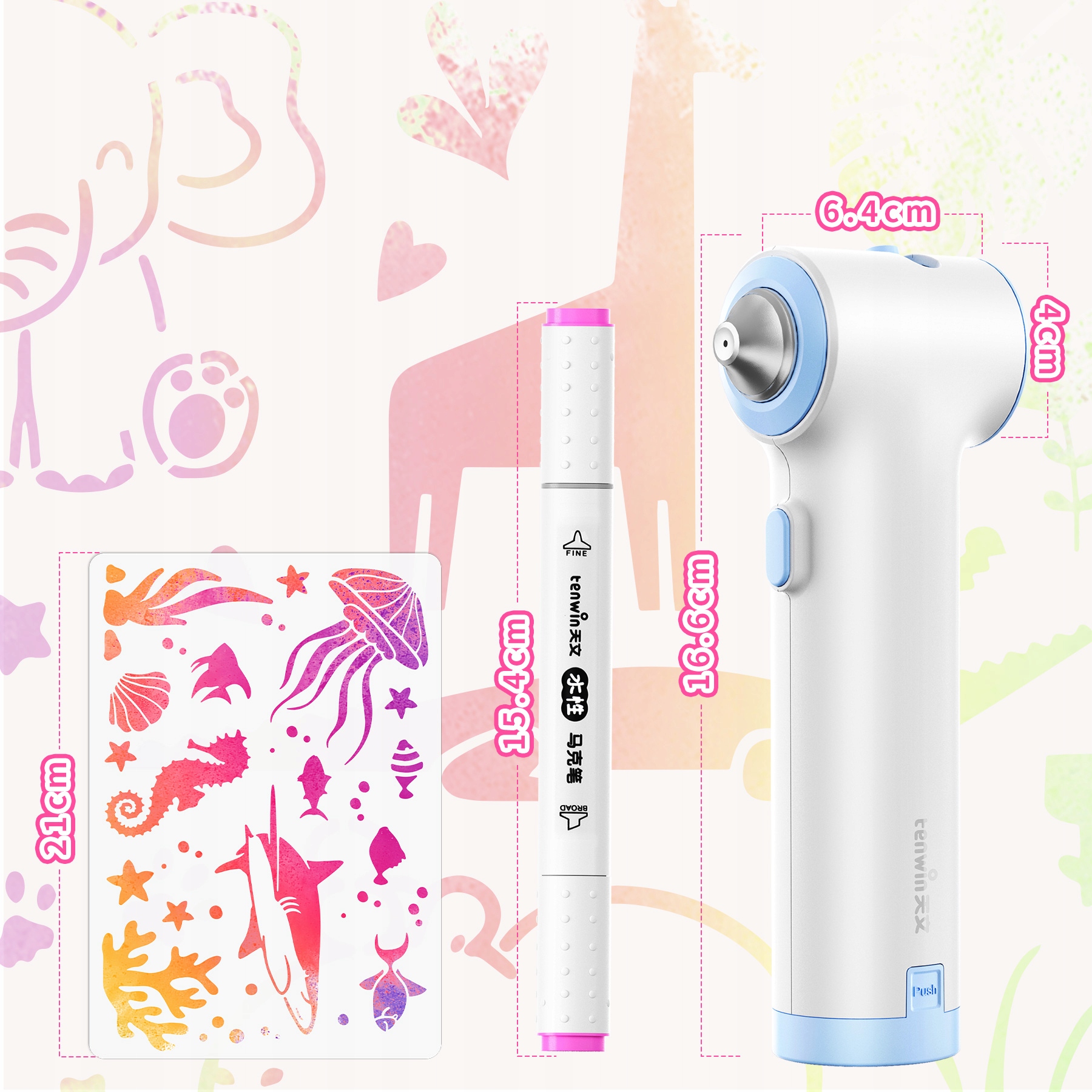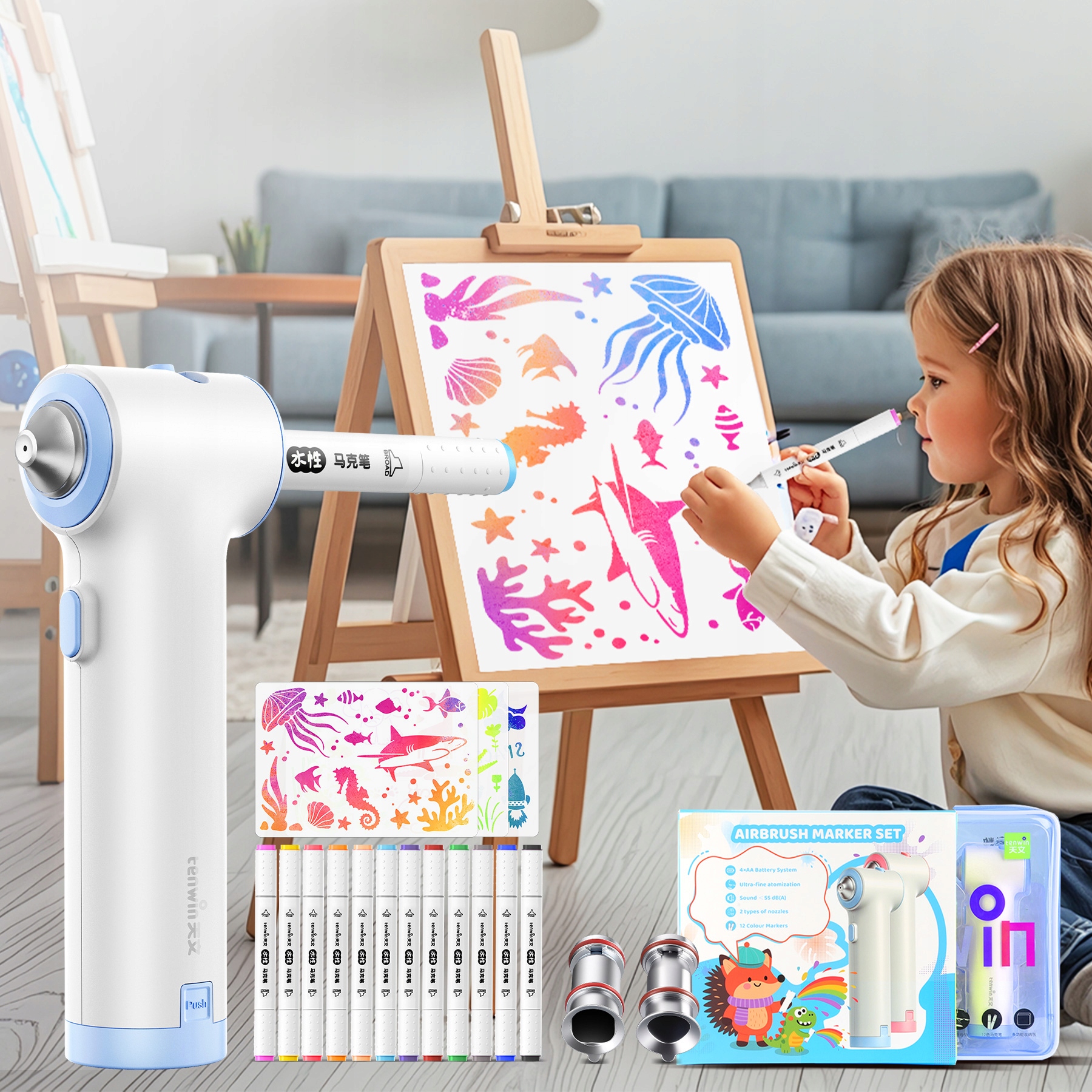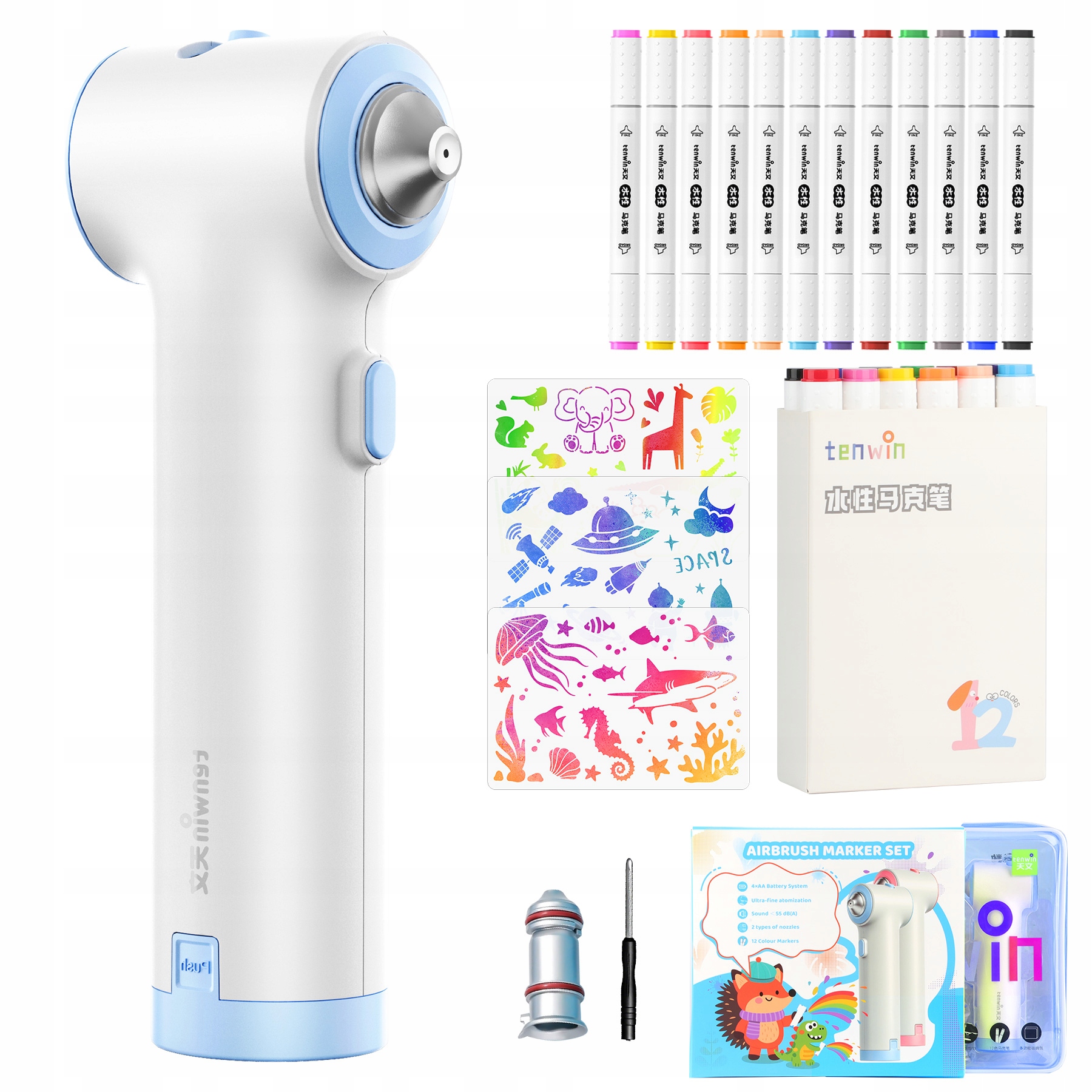 Все, что вам нужно для творческих путешествий, в одной коробке: 1 аэрограф (батарейка в комплект не входит), 12 маркеров с двумя наконечниками, 3 многоразовых трафарета, 1 квадратная насадка, 1 прочная сумка для хранения и 1 мини-отвертка. Идеально подходит для начинающих и молодых художников!