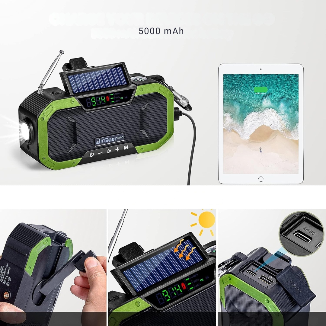 airgearpro Radio с функцией зарядки мобильного телефона, 5000 мАч PowerBank с USB, FM/AM, динамо, водонепроницаемой IPX5, светодиодным фонариком, идеально подходит для активности на открытом воздухе. h1>