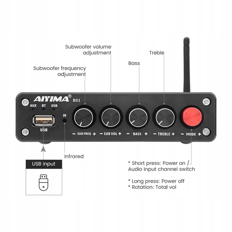 AIYIMA B01 — простой интегральный усилитель небольшого размера. Предложенной мощности усилителя достаточно для начинающих меломанов и для управления менее требовательными аудиосистемами. Возможность подключения устройств через Bluetooth 5.0 и использования сабвуфера.