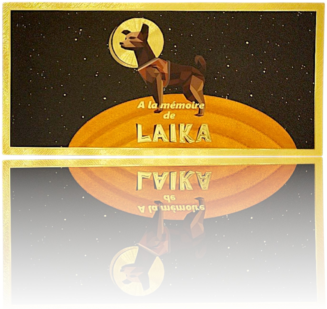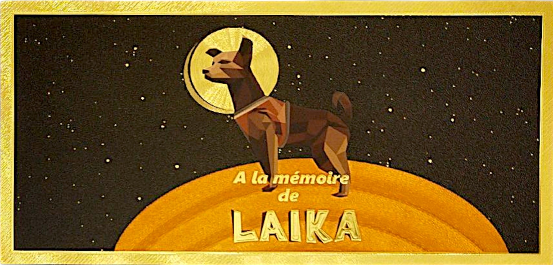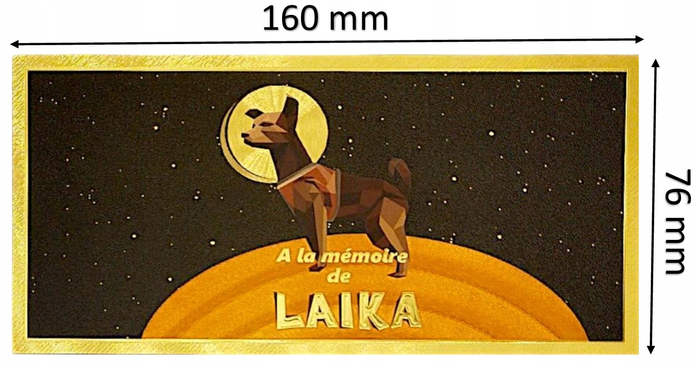 Уникальный сувенир для коллекционеров и любителей космической истории — позолоченная коллекционная банкнота из ПВХ, посвященная Лайке, первой собаке, побывавшей в космосе.