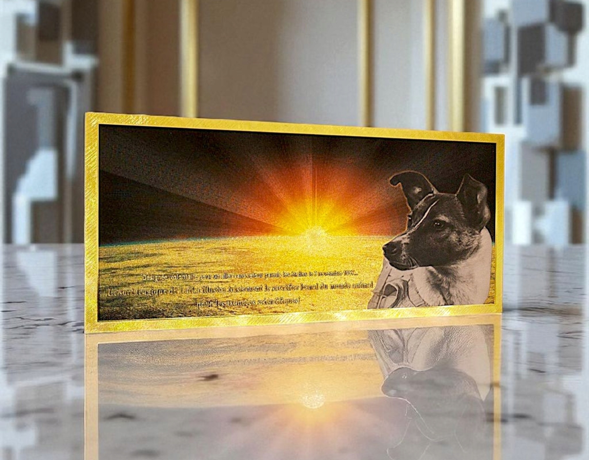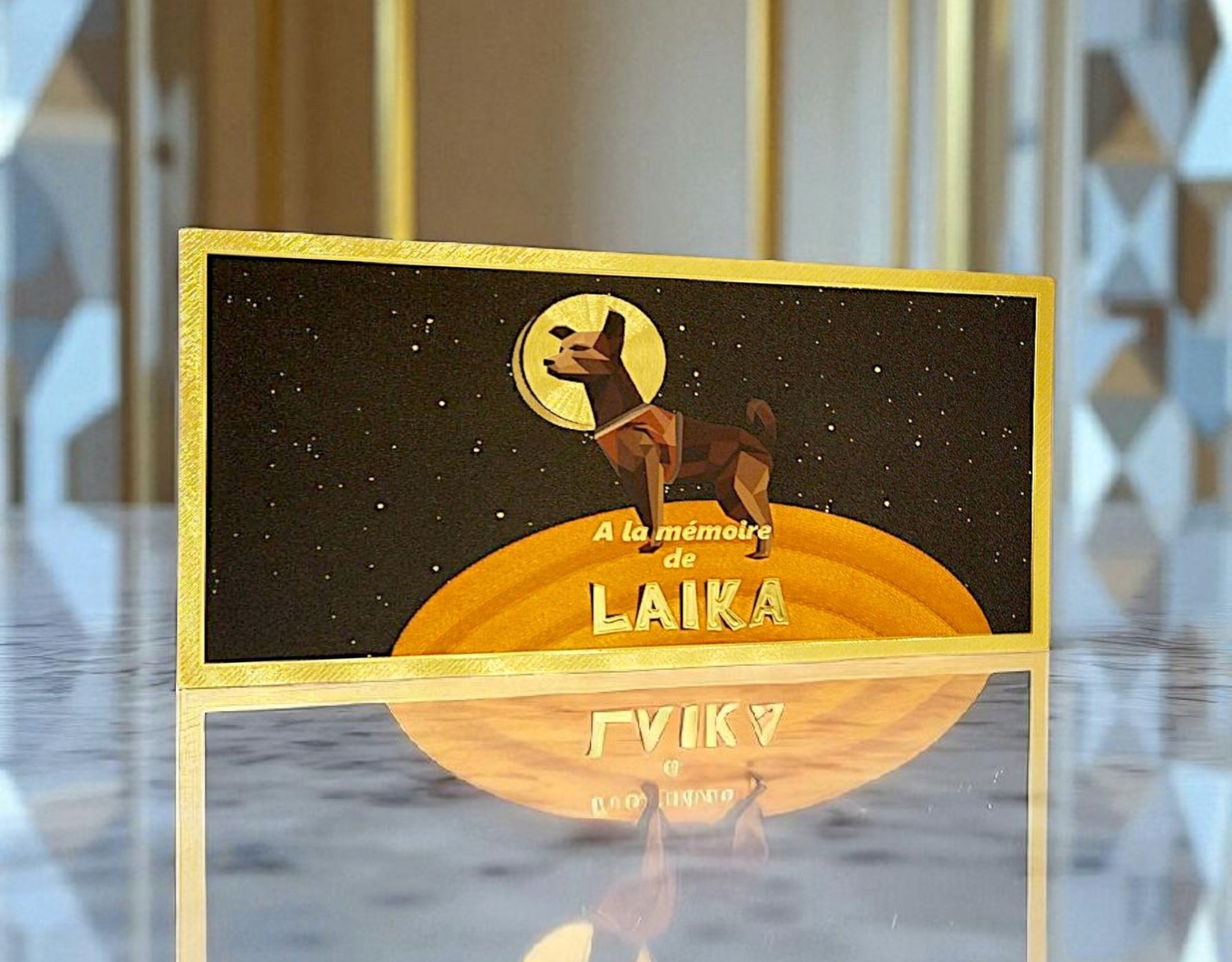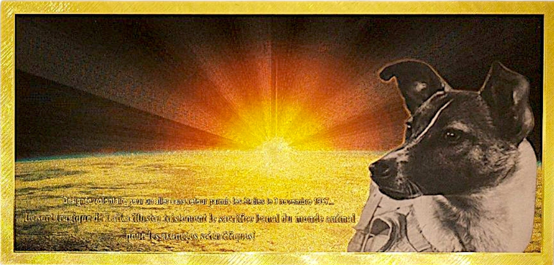 Уникальный сувенир для коллекционеров и любителей космической истории — позолоченная коллекционная банкнота из ПВХ, посвященная Лайке, первой собаке, побывавшей в космосе.