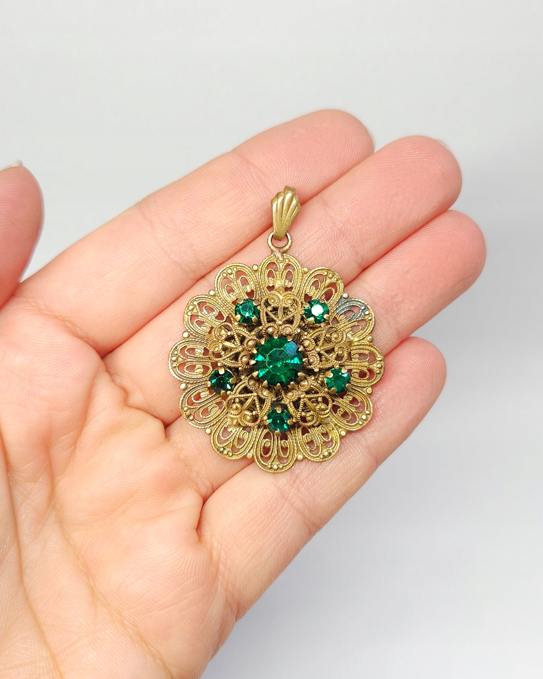 Позолоченный ажурный кулон с зелеными камнями, позолоченная латунь