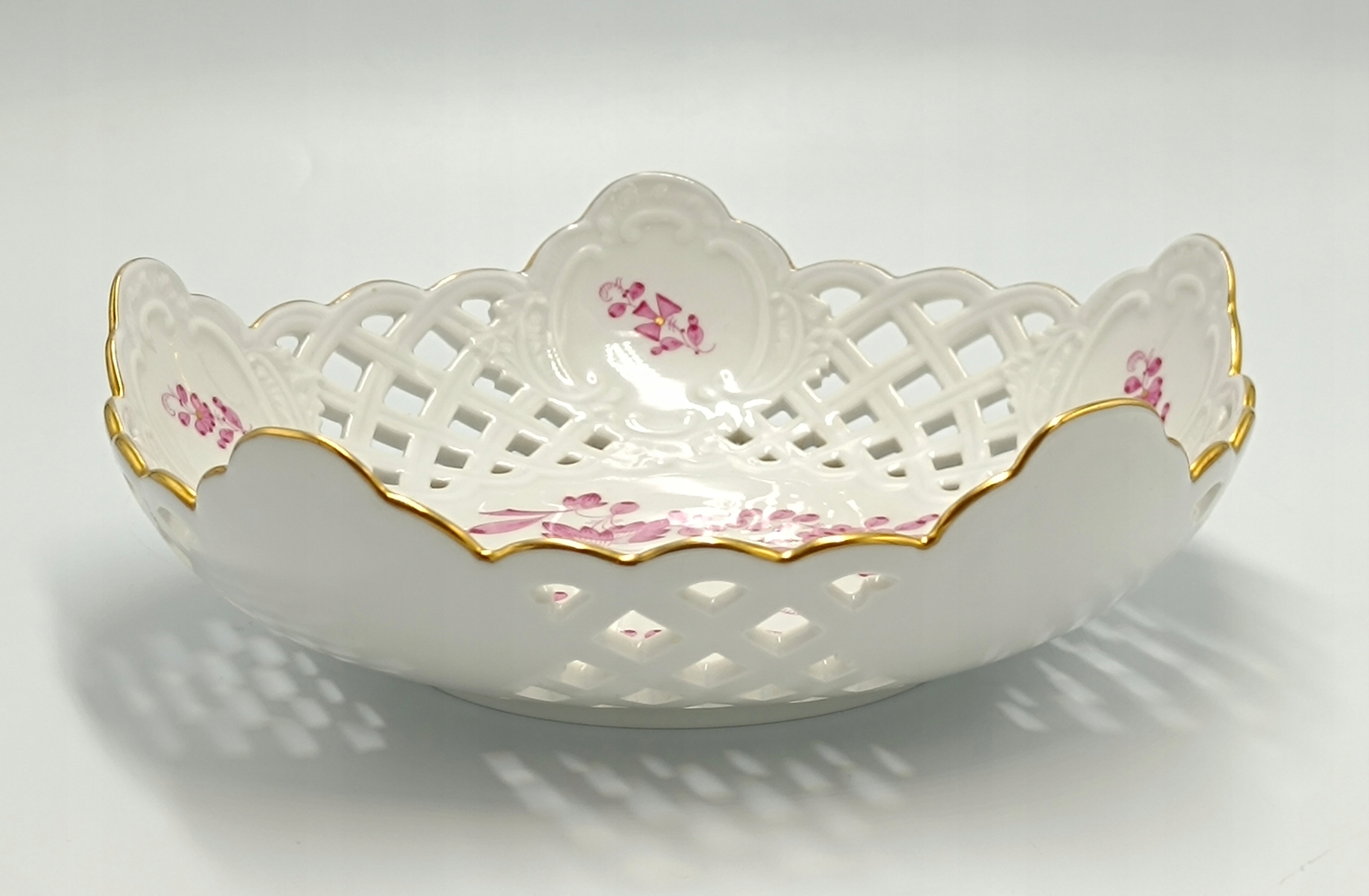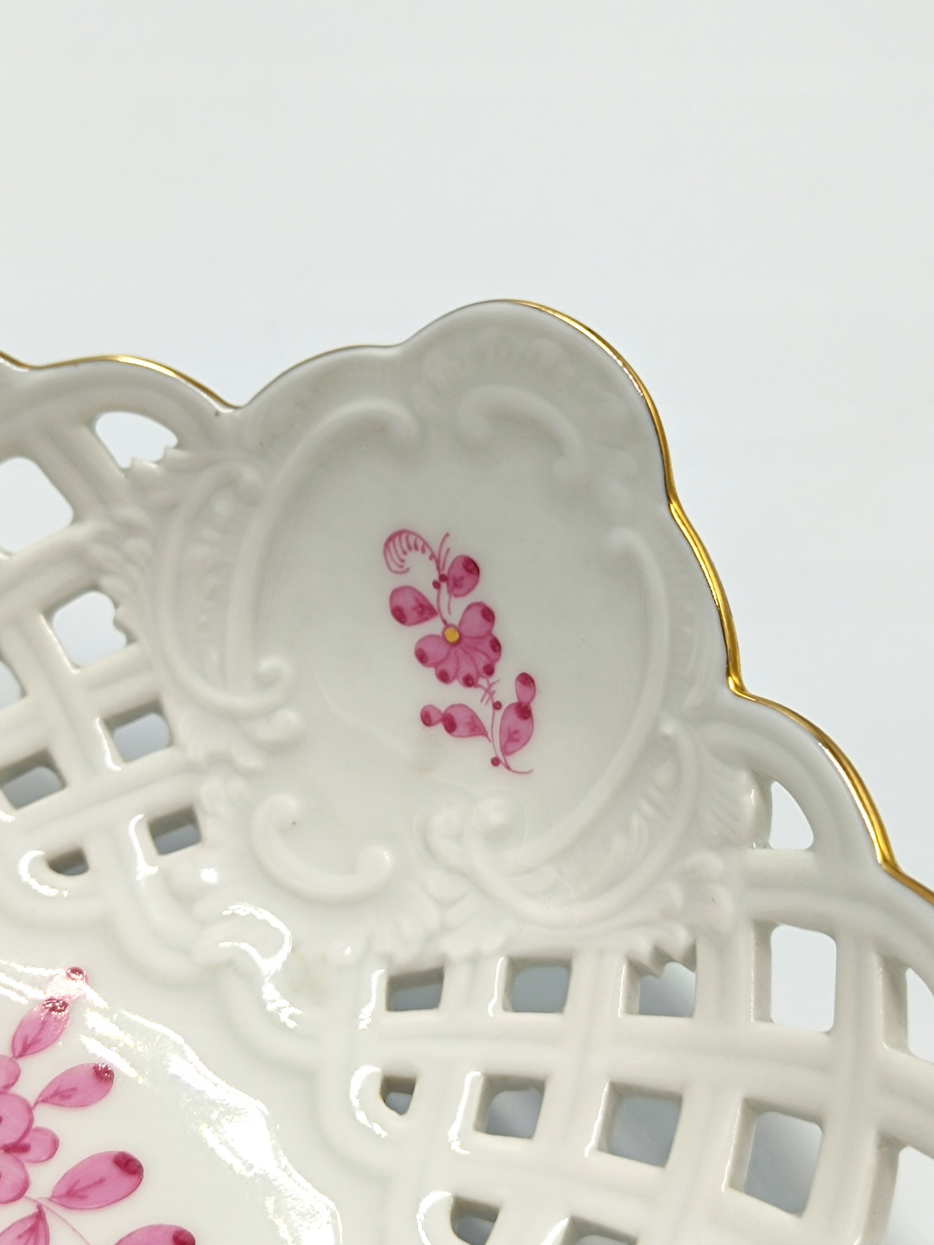 Тарелка изготовлена из первоклассного белого фарфора высочайшего качества. Украшен красивым цветочным мотивом в розовых тонах, вдохновленным восточноазиатскими узорами, который также является одним из старейших декоров этой мануфактуры. Дополнительно дополнена очень тонкой, тонкой позолоченной полосой по краю тарелки, что придает ей еще больше шарма и элегантности. Подпись внизу.