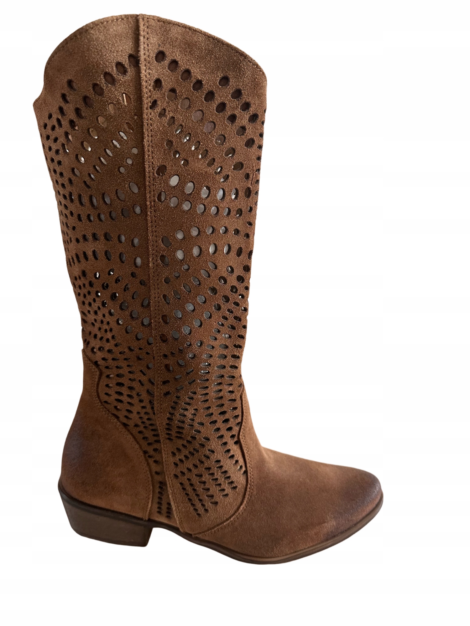 Очень эффектные ботинки из натуральной замши. Сапоги великолепно смотрятся как с платьем, так и с брюками. Гулять в них можно в любое время года. Каждый из нас мечтает об ажурных сапогах в западном стиле, поэтому позвольте себе такую роскошь.