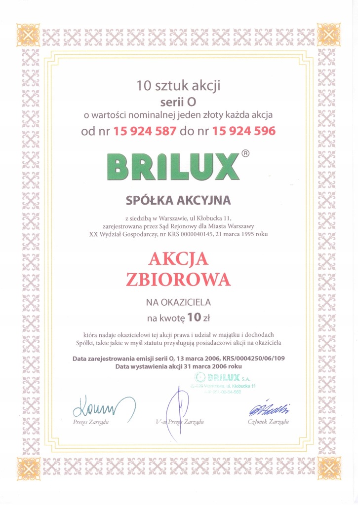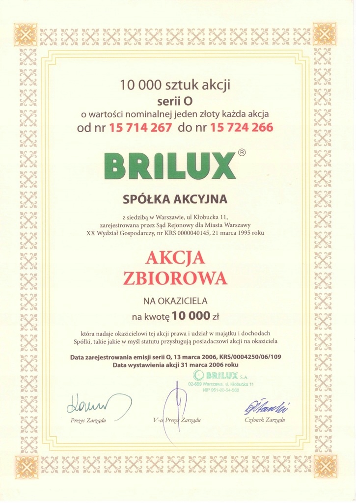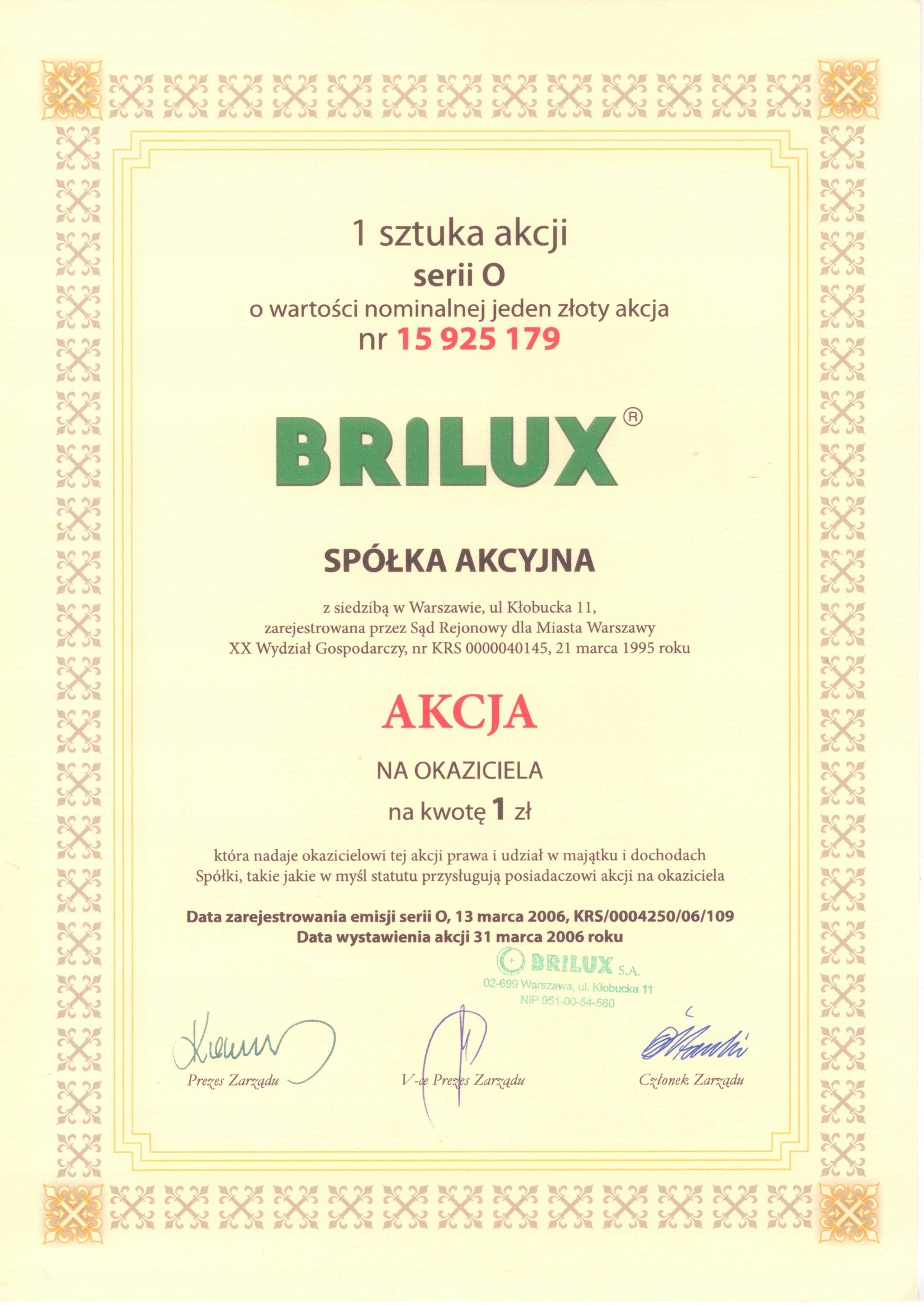 Аукцион проводится по акциям на предъявителя серии «О» в количестве 1 шт. SPÓŁKA AKCYJNA «BRILUX». Дата регистрации выпуска серии «О» – 13 марта 2006 года. КРС /0004250/06/109 оригинал на бумаге ручной работы
