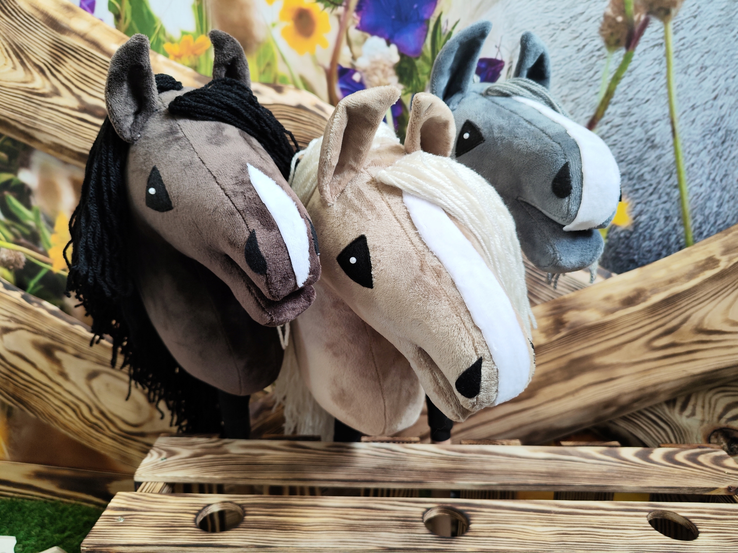 Лошадь изготовлена из мягкого норкового материала, набита. с силиконовым шариком. Насажена на короткую деревянную палочку, пришита машинкой, грива выполнена из пряжи.