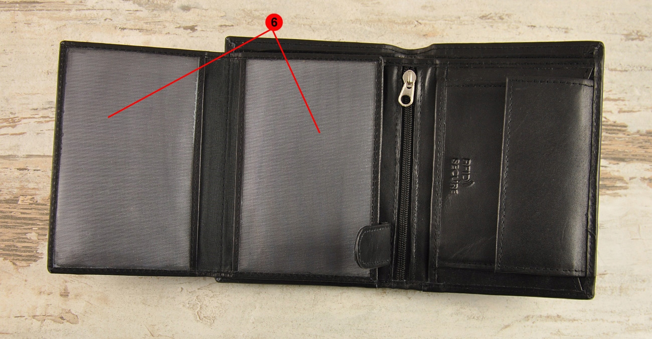 Портфолио блокирует сигналы RFID, используемые в близовых картах. В настоящее время большинство карт, выпущенных банками, представляют собой карты с бесконтактной технологией. Благодаря блокаде не произойдет, что кто -то поставит сканер в наш карман или сумку и передаст небольшую сумму на свой счет, который мы даже не заметим.