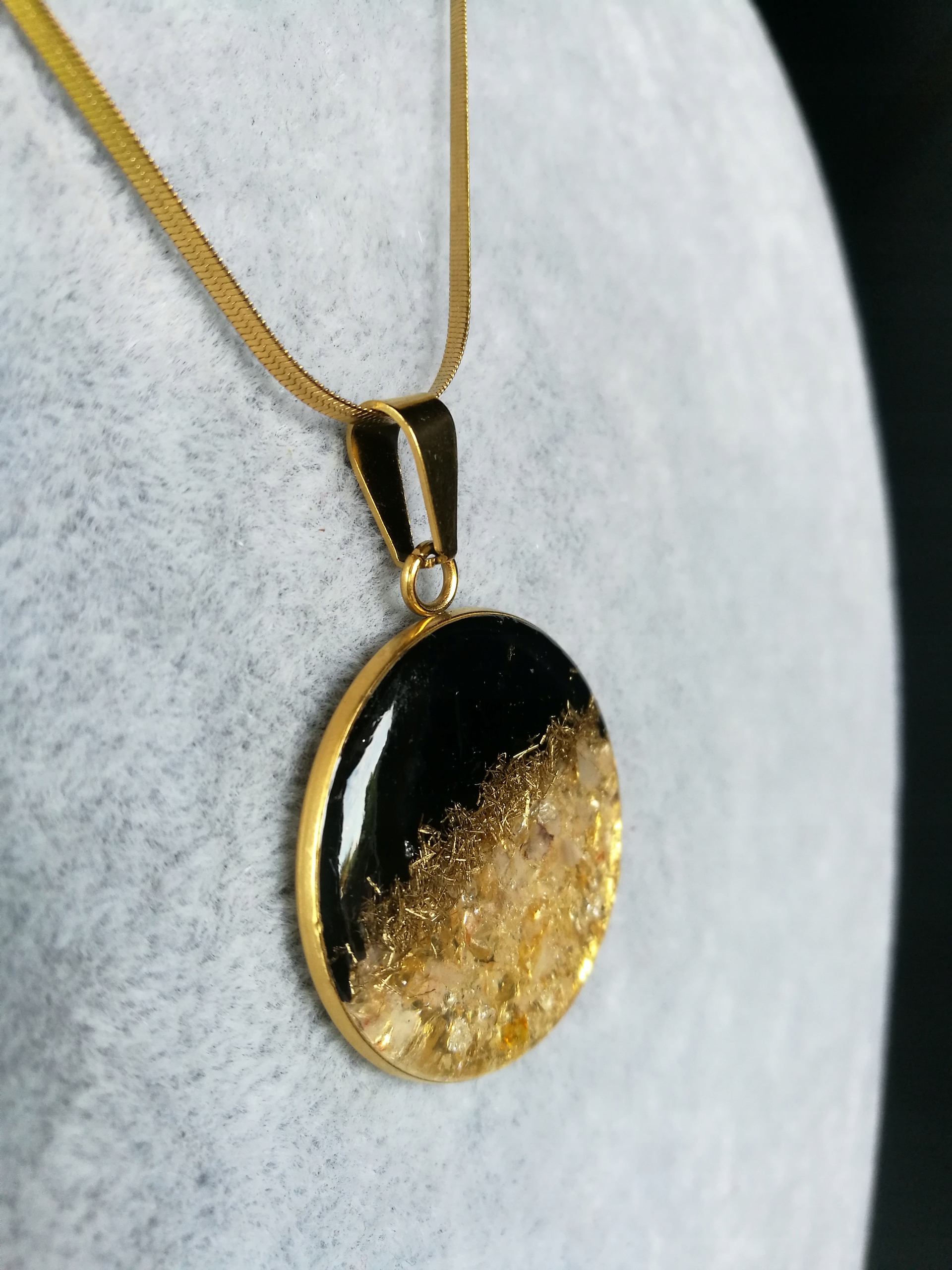 - Один оргонит с e кожа Круглый Восковой с цепью из нержавеющей стали позолоченной K18 50 см и шириной 2 мм.