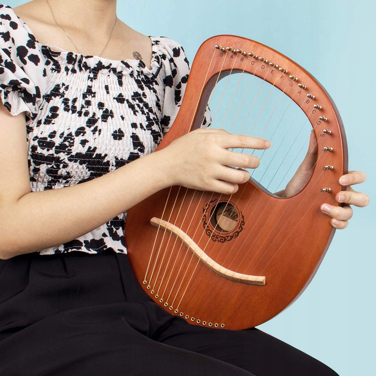16 СТАЛЬНЫХ СТРУН: 16 металлических струн лиры, оснащенных прочными стальными струнами. Звук звенит и может заполнить всю комнату. Чем короче струна, тем выше тон. То же самое и с натяжением струн.