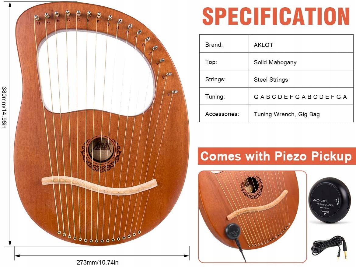 ЛИРНАЯ АРФА из красного дерева: лирическая арфа Aklot, вырезанная из куска красное дерево. Древесина высокой твердости и плотности достаточно прочна, чтобы сохранять тон и избегать давления струн на древесину. Инструмент обладает теплым голосом и приятным звучанием.