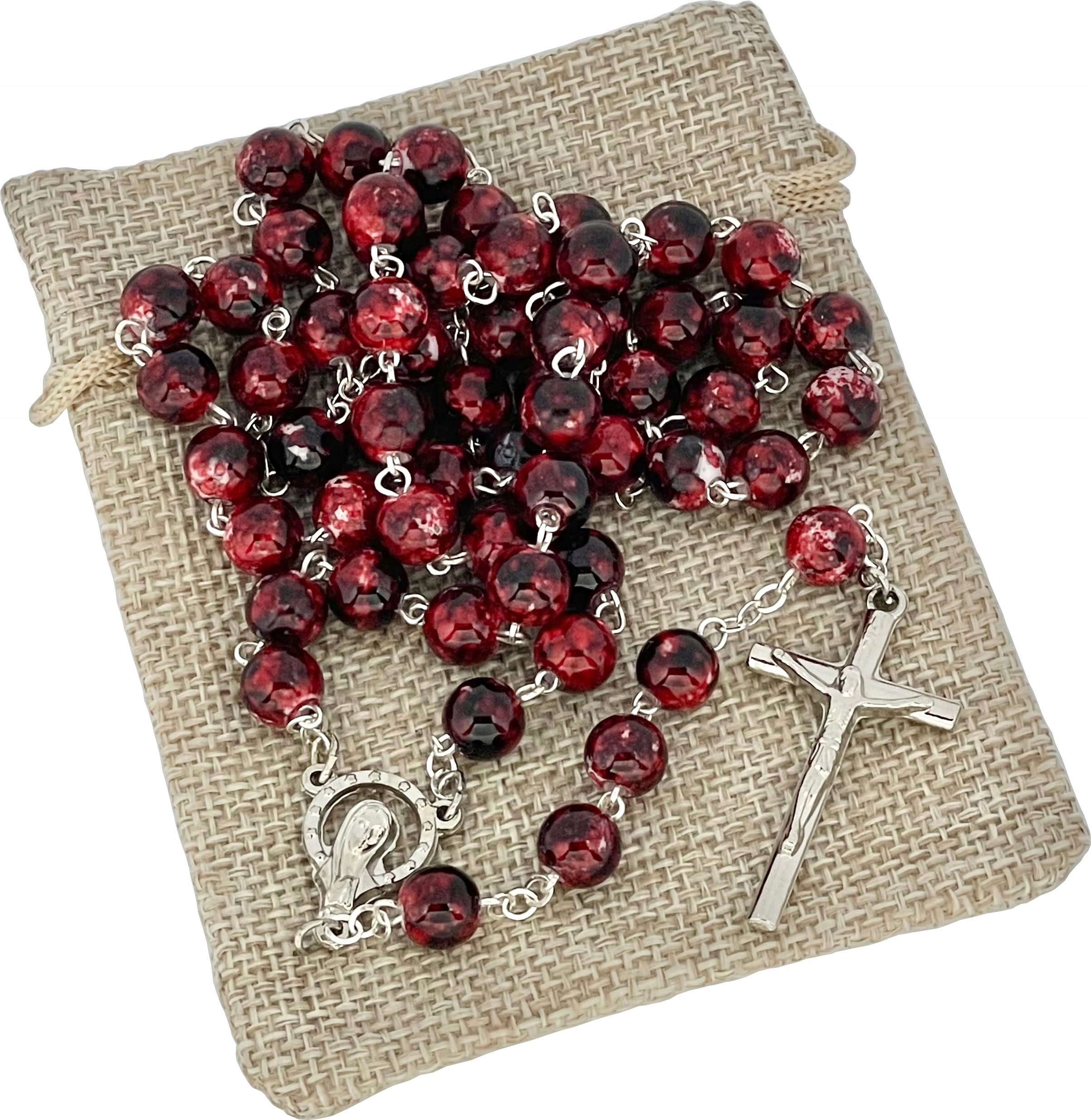 АКРІЛОВИЙ РОЗАРІЙ ЧЕРВОНОГО БОРДОВОГО В ДЖУТОВОМУ МІШКУ