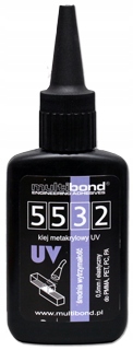 Однокомпонентный акриловый клей, который под воздействием УФ-лучей он затвердевает в так называемом радикальная полимеризация, при которой схватывается только в закрытом шве (клей остается липким вне шва. Клей хорошо сцепляется со стеклом, металлами, твердыми и гибкими материалами. Позволяет создавать эстетичные, полностью прозрачные и бесцветные швы. Устойчив к воде, пару и много химикатов