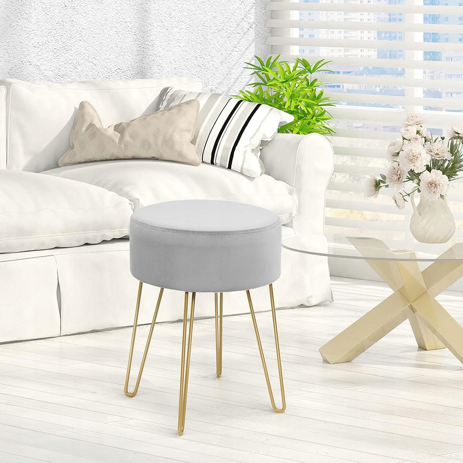Универсальное использование: Золотая металлическая основа и бархатное сиденье создают элегантный и простой стул. Благодаря простому внешнему виду его можно использовать как табурет для макияжа в спальне или подставку для ног в гостиной.