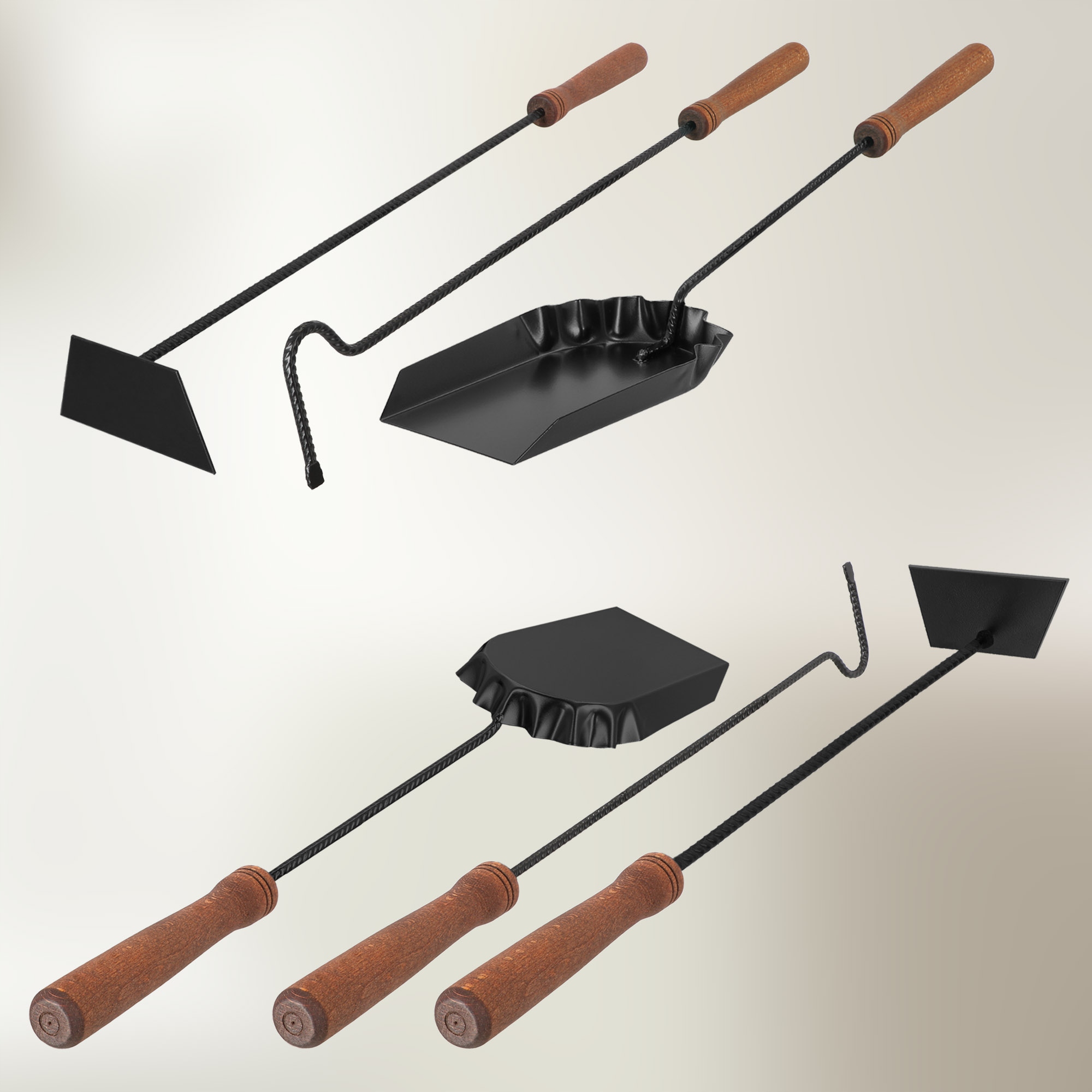 - В комплект входят инструменты, необходимые для чистки камина – кочерга, скребок, угольная лопата, оборка и угольные грабли.