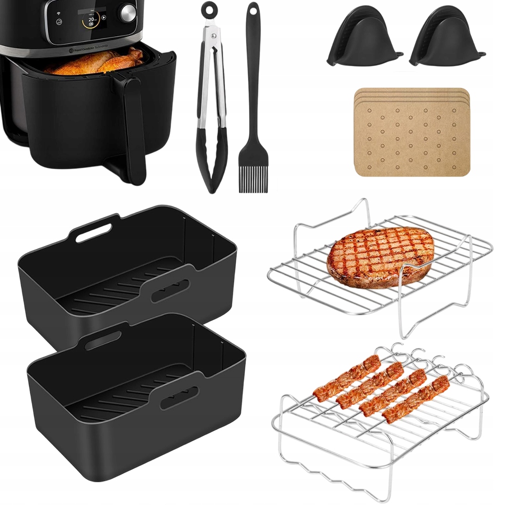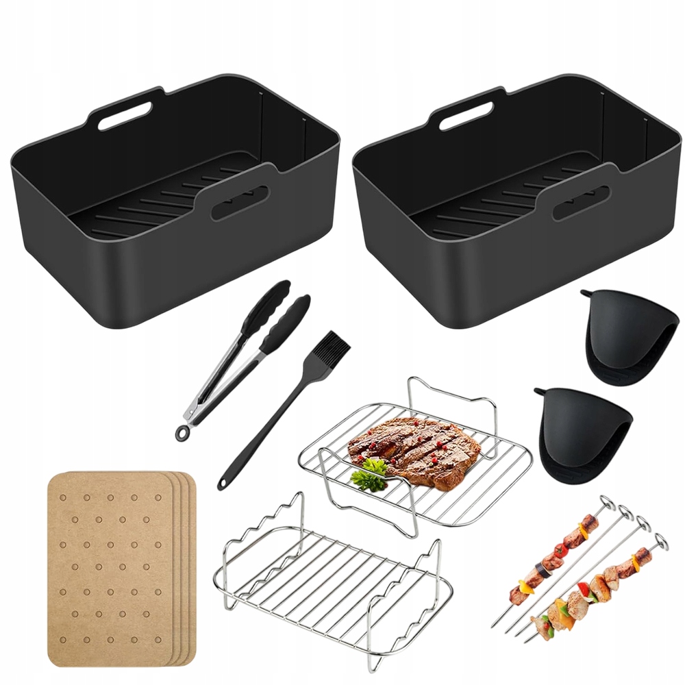 ⭐【НАБОР АКСЕССУАРОВ, 9 ПРЕДМЕТОВ】 - В каждую упаковку входят 2 силиконовые корзины для форм, 1 многофункциональная металлическая подставка, 1 металлический держатель для шампуров, 4 держателя для шампуров, 1 щипцы для еды, 100 листов бумаги для выпечки, 1 кисточка для смазки и 2 силиконовые перчатки, которые помогут вам приготовить картофель фри, жареную курицу, шашлык и другие вкусные и полезные блюда. экономия времени и энергии