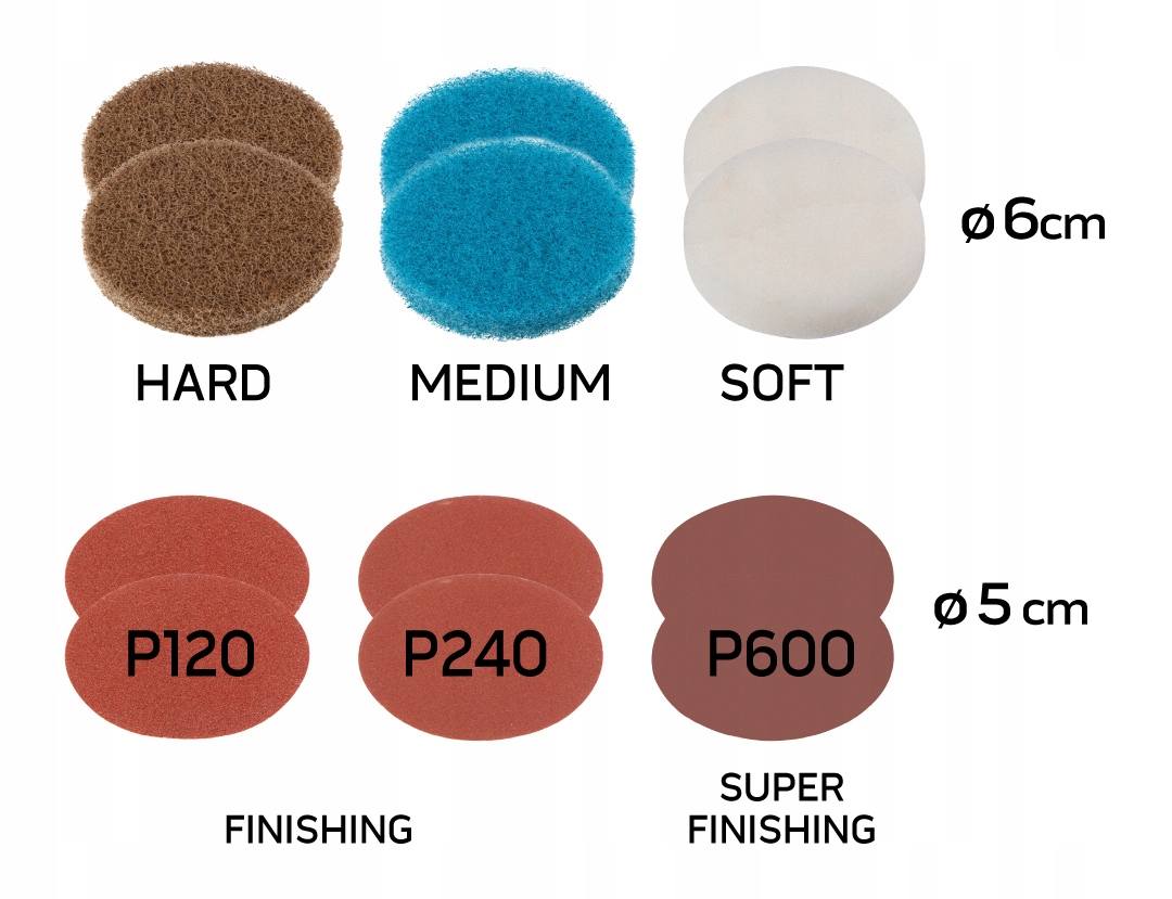 - 2 твердых абразивных насадки (диаметр 6 см) – идеально подходят для более интенсивной полировки и работы с более твердыми поверхностями.