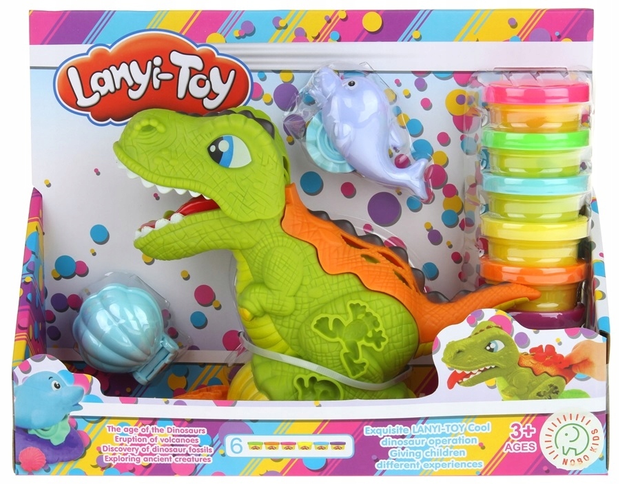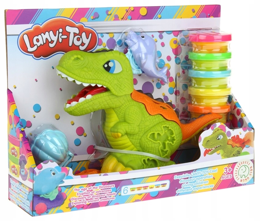 Познакомьтесь с королем динозавров, дружелюбным тираннозавром! Этот уникальный динозавр любит делать громкие шаги, кусать и мять тесто для лепки. Испытайте настоящее юрское приключение! Из пластилина подготовьте язык и чешую динозавра, а благодаря формочкам, размещенным на ногах, вы сможете создавать различные аксессуары и животных прямиком из эпохи динозавров.