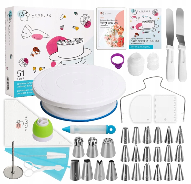Этот обширный набор позволит вам создавать всевозможные украшения для кексов, пралине, тортов и пирожных и прекрасно презентовать деликатесы. Различные виды насадок для канта, декоративные маркеры для надписей, ножницы для торта, скребки и палитры для рисования превращают декорирование в настоящее занятие, которое хочется повторять снова и снова.