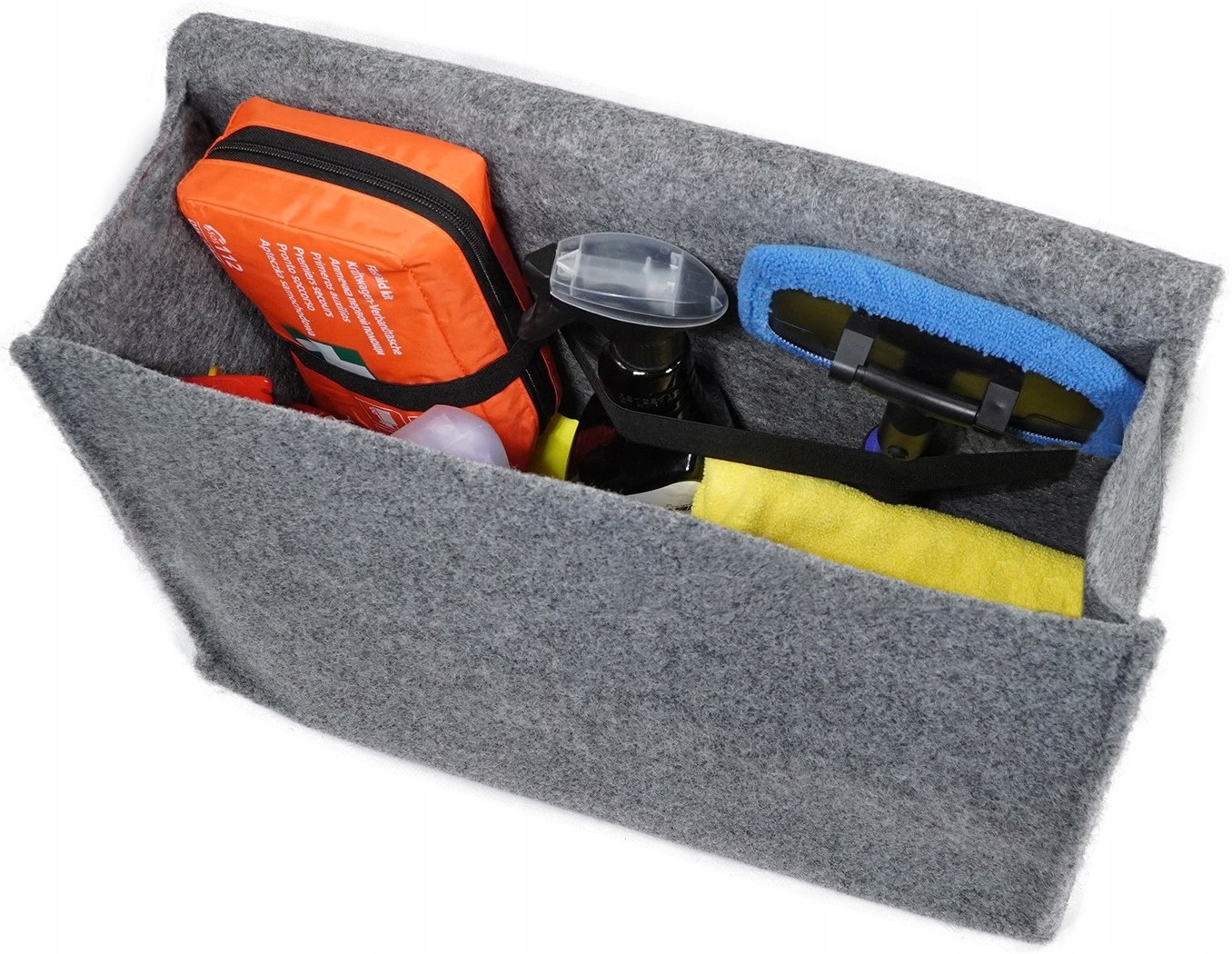 Оснащена прочной ручкой и липучкой, предотвращающей перемещается в багажнике. На стене внутри имеется дополнительная резинка, позволяющая дополнительно крепить предметы внутри.