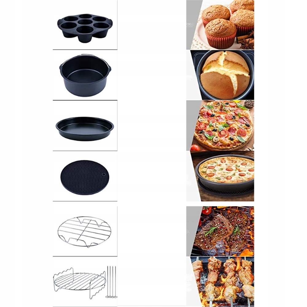 - В этот набор аэрофритюрницы входит 6 деталей для удовлетворения различных кулинарных потребностей: 1 металлический держатель, 1 подставка для шампуров, 1 бочонок для теста, 1 силиконовый коврик, 1 форма для пиццы, 1 форма для торта.