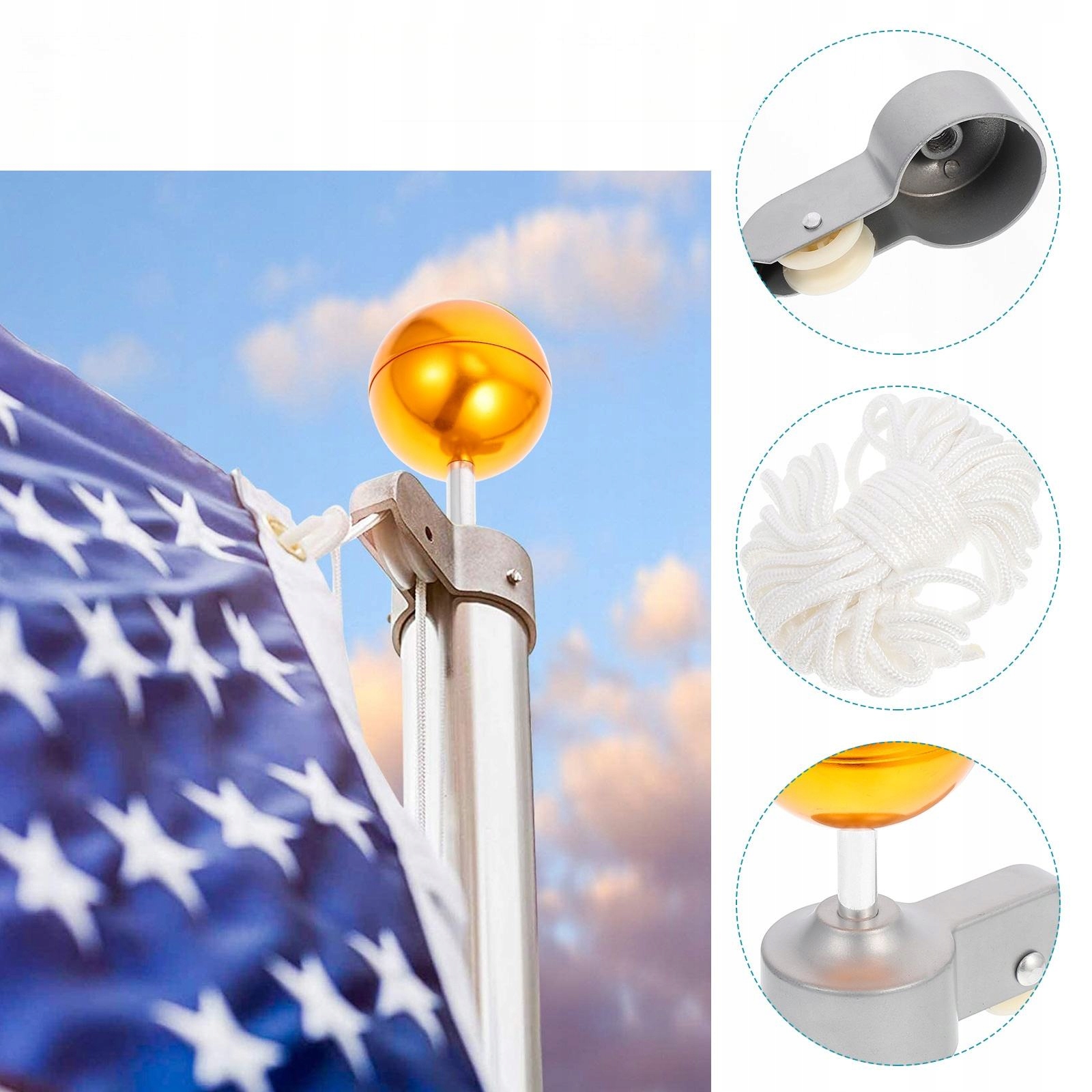 ✅ 1 противоскользящий крюк 2 поворотных крючка 1 шкив для флагштока 1 верхний шар для флагштока 1 веревка 2 болта 1 гайка 1 крышка гайки