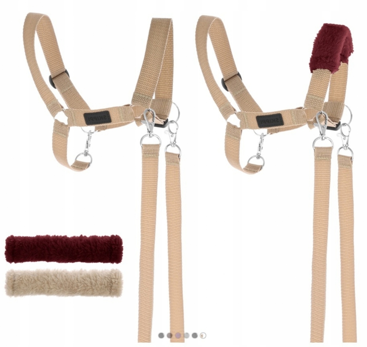 - Комплект «3 в 1» — недоуздок, поводья (100 см), 2 сменных меха (9 см)
