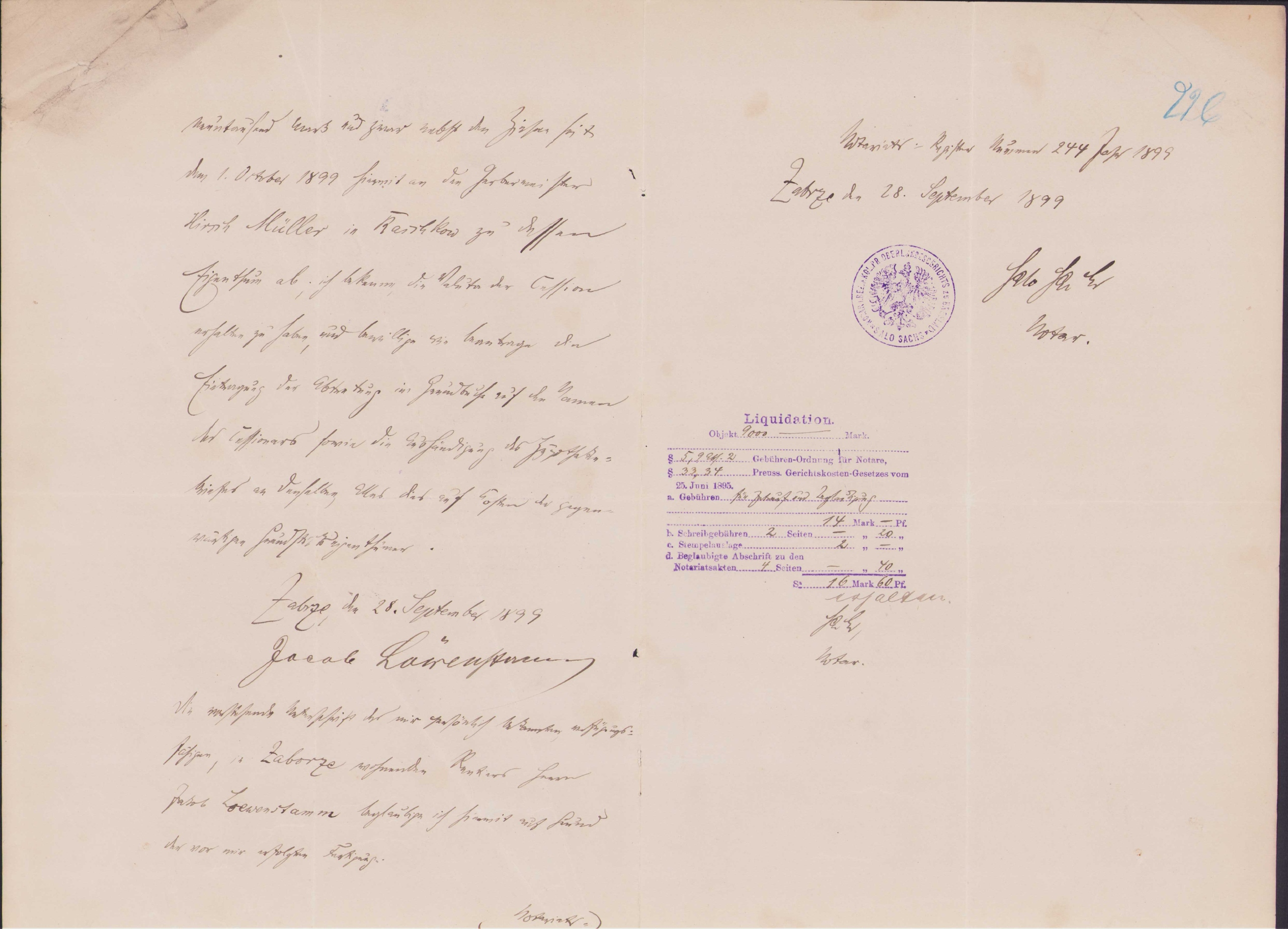 Акт Sachs Rechtsanwalt und Notar ZABRZE 1899