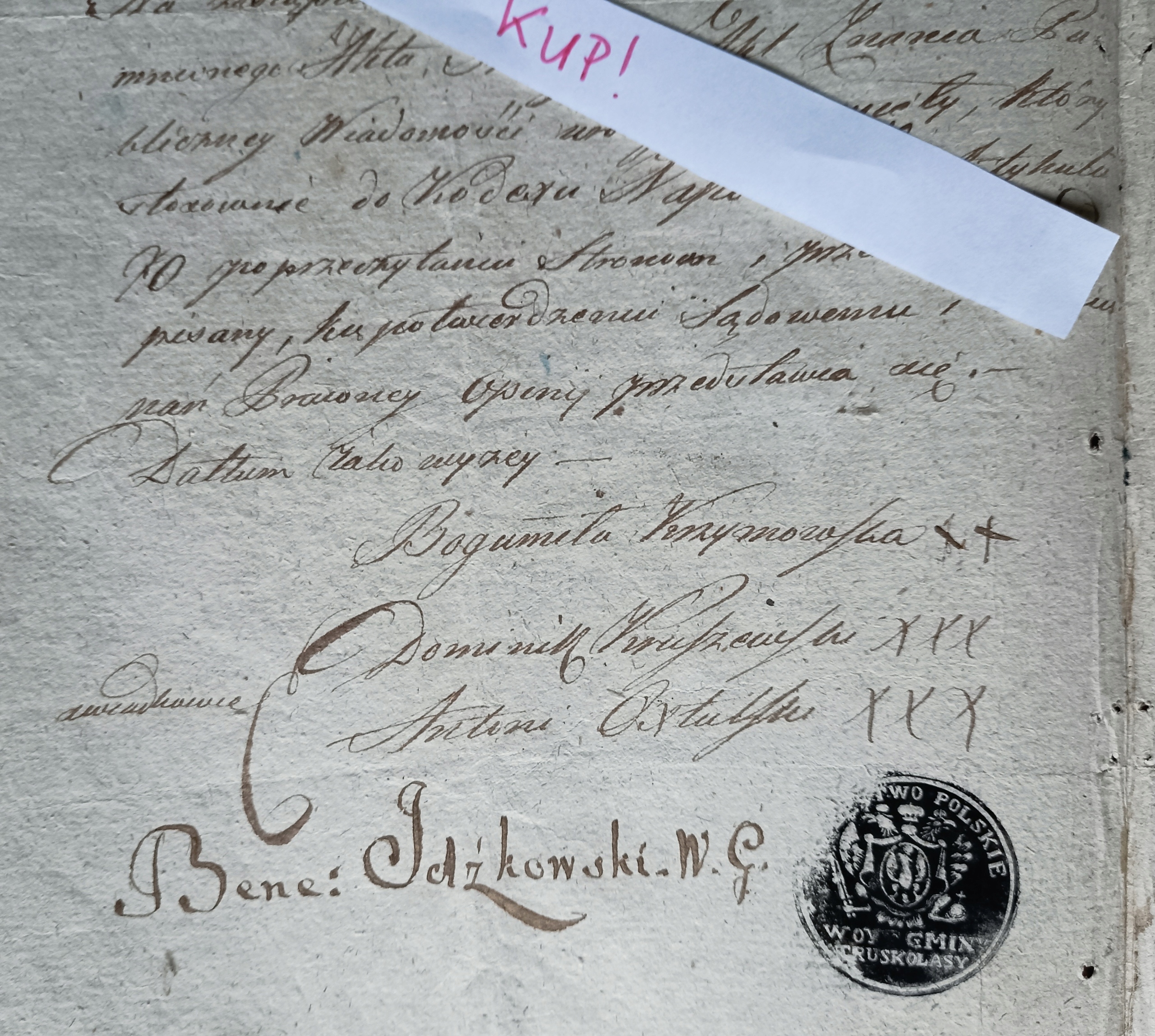Письмо подготовил и подписал мэр коммуны Трусколасы Бенедикт Идзковский, а затем под аккуратной подписью красиво оттиснута чернильная печать мэра с надписью: KRÓLESTWO POLSKIE WOYT GMINY TRUSKOLASY. Все это дополняет герб Королевства Польского.