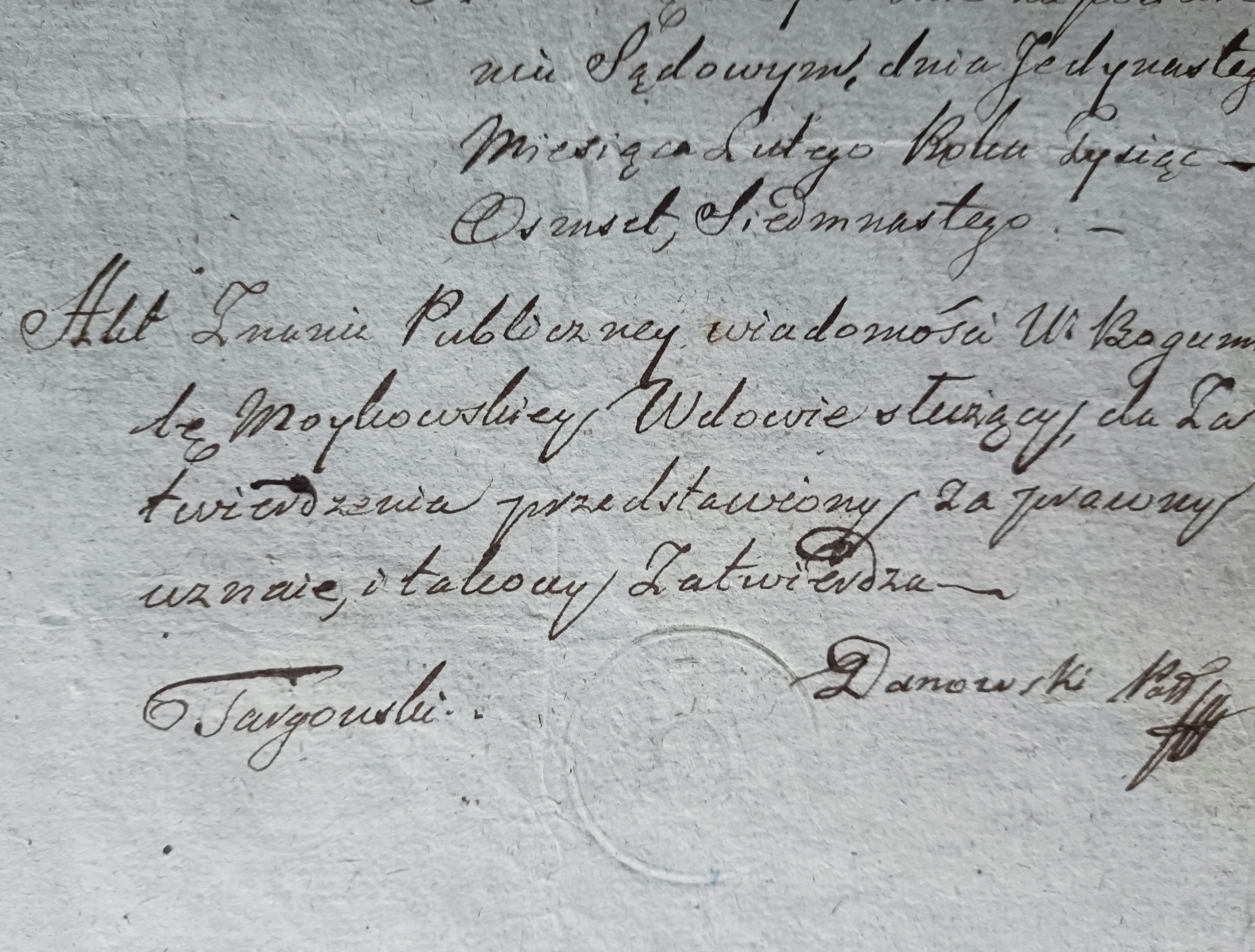 Вдова (причём двойная - урожденная Кшимовская, I voto Kruszewska II voto Мойковская) из села Трусколасы Невиско, дворянки, не сумевшей получить свидетельство о рождении (и она хотела снова выйти замуж), представила свидетелей, знавших ее и сообщивших, кто она, каков ее статус и т. д. Письмо было подписано Кшимовской и свидетелями крестами.