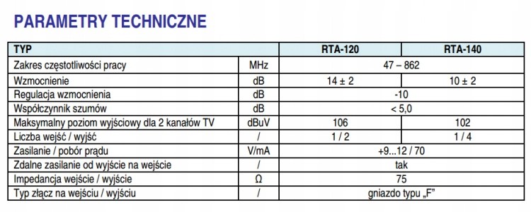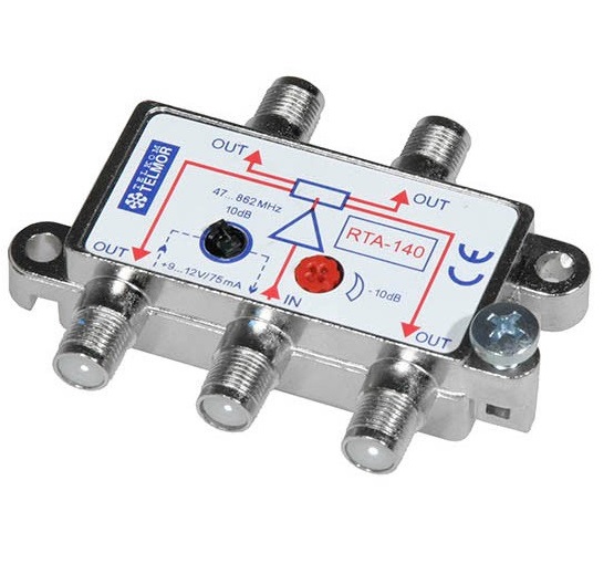 Активные разветвители типа RTA-140 предназначены для работы в индивидуальных установках распределения сигнала RTV. Возможно питание четырех ТВ-приемников антенным или кабельным ТВ-сигналом. Сплиттер имеет возможность регулировки коэффициента усиления и перемычку, позволяющую передавать напряжение питания с обозначенного выхода (OUT) на вход (IN). Питание сплиттеров осуществляется по коаксиальному кабелю с помощью дополнительный разделитель напряжения.