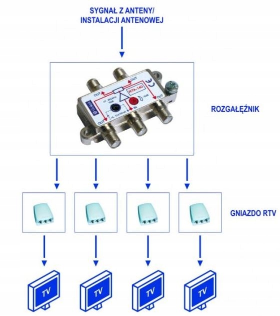 Активные разветвители типа РТА-140 предназначены для работы в индивидуальных установках распределения сигнала РТВ. В зависимости от типа используемого разветвителя можно запитать два или четыре ТВ-приемника антенным или кабельным ТВ-сигналом. Каждый тип сплиттера имеет встроенный потенциометр регулировки усиления и перемычку, позволяющую передавать напряжение питания с обозначенного выхода (OUT) на вход (IN). Питание разветвителей осуществляется через коаксиальный кабель с использованием дополнительного разделителя напряжения.