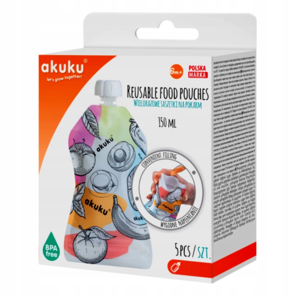 Саше Akuku — отличное решение для мам, которые готовят муссы, йогурты, супы и т. д. Идеально подходят для использования. дома, на прогулке или в путешествии. Благодаря нашим многоразовым пакетикам вы обеспечите своего малыша лучшими продуктами собственного производства и обеспечите ему здоровое питание. Они имеют двойную застежку, которая предотвращает высыпание содержимого. Их очень легко наполнять, мыть и хранить.