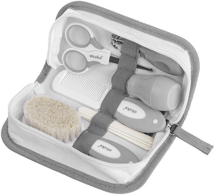 <ул>Набор для ухода за вашим ребенком в удобной и практичной косметичке. Ножницы (с тонкими металлическими лезвиями и закругленными краями) и щипчики помогут вам наверно и безопасно подстричь ногти и пилка легко уберет неровности ногтей, защитив ребенка от царапин. Мягкая щетка и расческа с противоскользящей ручкой позаботятся о головке вашего малыша. Груша с мягким кончиком предназначена для очистки дыхательных путей и удаления воды и серы из ушей ребенка.