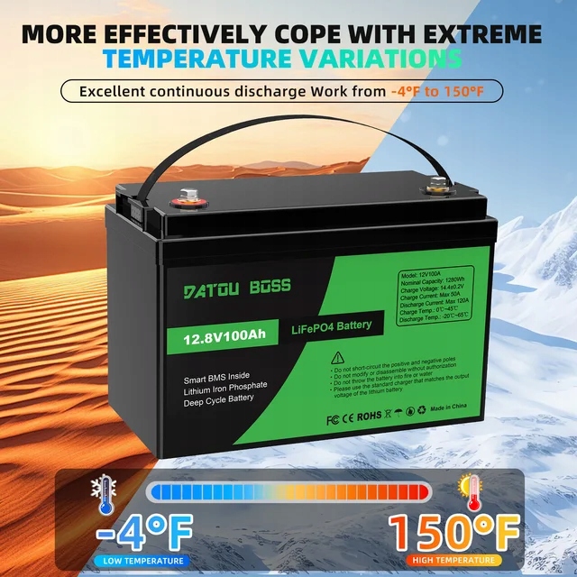 Аккумуляторы DATOUBOSS 12 В, 100 Ач lifepo4 изготовлены из классических автомобильных литий-железо-фосфатных аккумуляторов и имеют корпус из АБС-пластика и имеют более высокую частоту энергии, более стабильную работу и большую мощность после проверки качества и испытаний, чтобы гарантировать работоспособность каждой батареи.