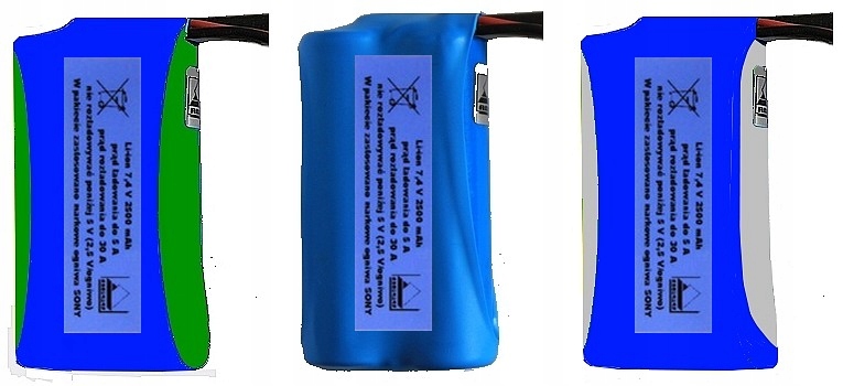 Оригинальные футболки SONY зеленого цвета (фото слева). Некоторые аккумуляторы имеют элементы, закрытые синей сменной гильзой (среднее фото) или прозрачной, через которую хорошо виден тип элементов (фото справа)