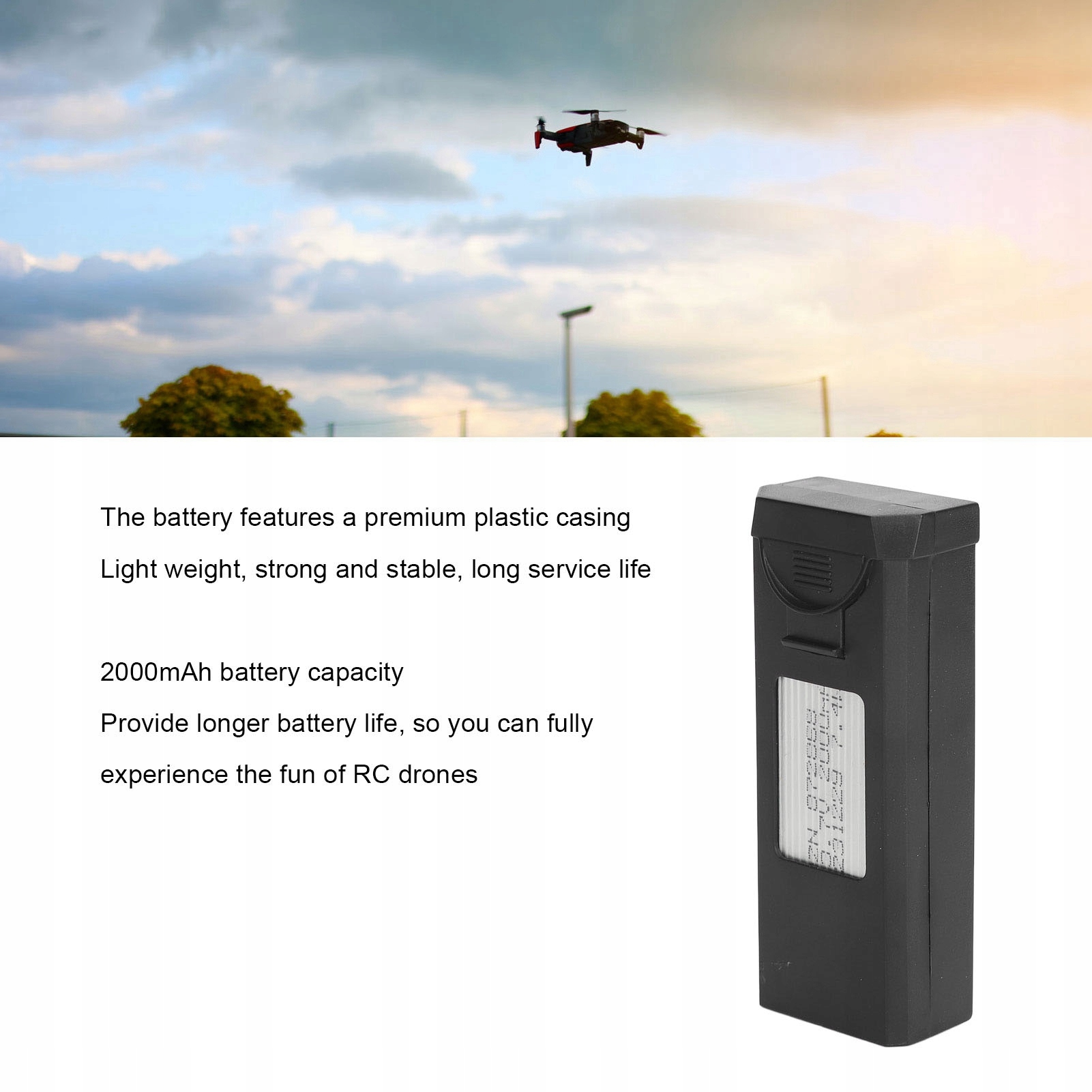2. Увеличенный срок службы батареи: LiPo-аккумулятор емкостью 2000 мАч обеспечивает более длительный срок службы, поэтому вы сможете получать больше удовольствия от управления дроном. Вы можете получать больше удовольствия, не беспокоясь о частой замене батарей.