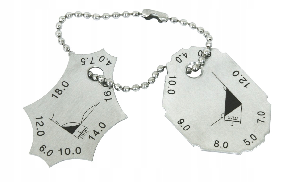 Шовный калибр для угловых швов с диапазоном измерения 4-12 мм, изготовлен из нержавеющей стали. Измеритель раствора состоит из двух частей.