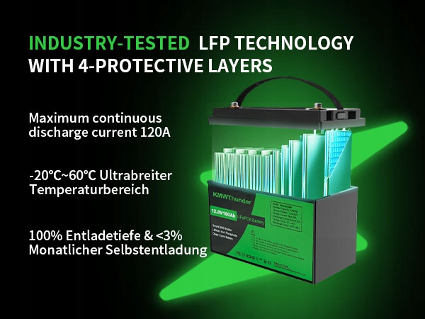 Аккумуляторы KMWThunder 12 В, 100 Ач lifepo4 изготовлены из литий-железо-фосфатных аккумуляторов автомобильного класса и имеют корпус из АБС-пластика и имеют более высокую частоту энергии, более стабильную работу и большую мощность после проверки качества и испытаний, чтобы гарантировать работоспособность каждой батареи.