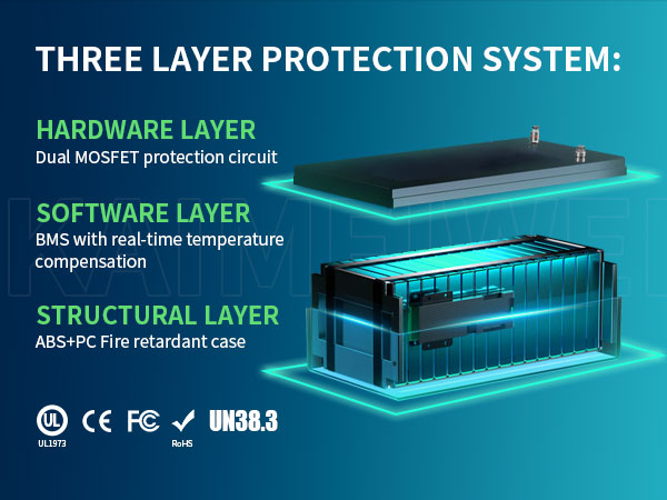 Аккумулятор LiFePO4 емкостью 100 Ач оснащен системой BMS 100 А, которая обеспечивает питание и разрядку, отличающуюся от других аккумуляторов. Он имеет функции автоматического выравнивания и 6 механических функций против перезаряда, глубокой перегрузки, перегрузки по току, перенапряжения, а также высокой и отключенной температуры для постоянного питания, устройства и продления срока службы переключателей батареи.