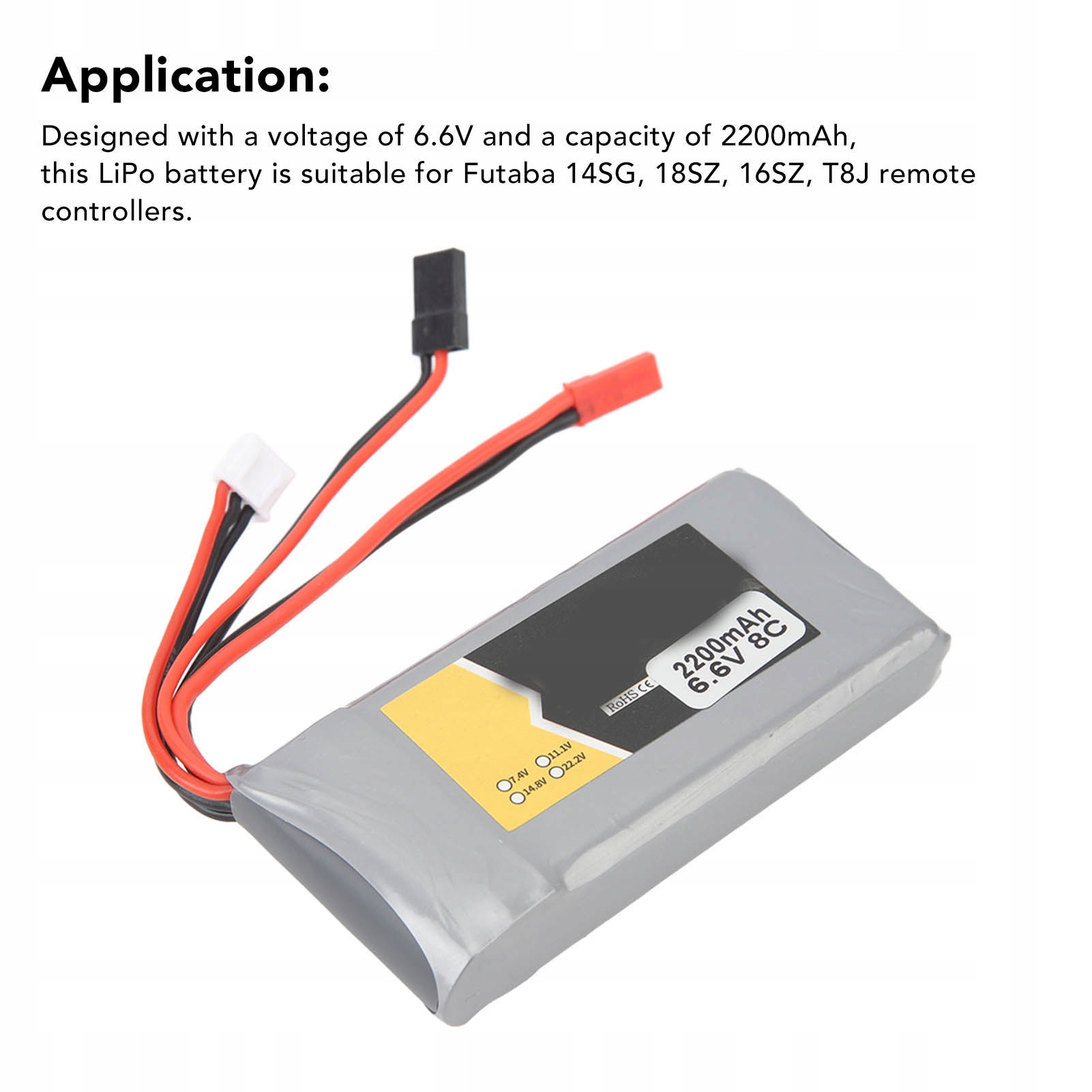 1. Применение: этот LiPo аккумулятор рассчитан на напряжение 6,6 В и емкость 2200 мАч и подходит для пультов дистанционного управления Futaba 14SG, 18SZ, 16SZ, T8J. 2. Компактный и портативный: липо-батарея небольшая и легкая, что позволяет легко переносить ее и гарантирует, что она не создает дополнительную нагрузку на пульт дистанционного управления во время использования. 3. Прочный и стабильный: высококачественный чехол для липо-аккумулятора обеспечивает его долговечность и стабильность. Он рассчитан на регулярное использование и обеспечивает длительный срок службы, обеспечивая при этом надежное питание. 4. Долговечность: благодаря большой емкости 2200 мАч липо-батарея обеспечивает более длительный срок службы батареи, что позволяет использовать передатчик в течение более длительного времени. 5. Безопасность в использовании: липо-батарея передатчика оснащена защитой от перезарядки и защитой от короткого замыкания, обеспечивая безопасность процесса зарядки.
