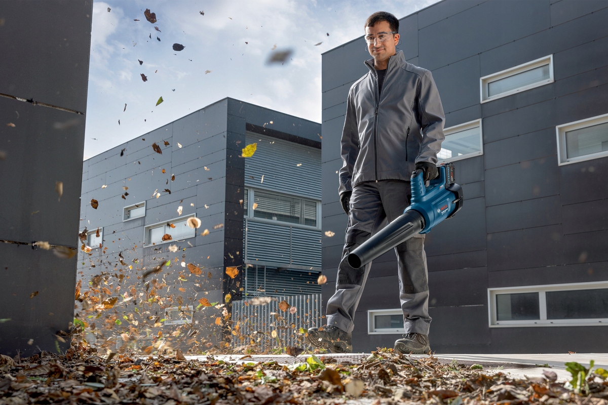 Вентилятор GBL 18V-750 от BOSCH столь же эффективен, как и обычные сетевые воздуходувки, и в то же время более удобен, легок и независим, поскольку не имеет шнура питания.